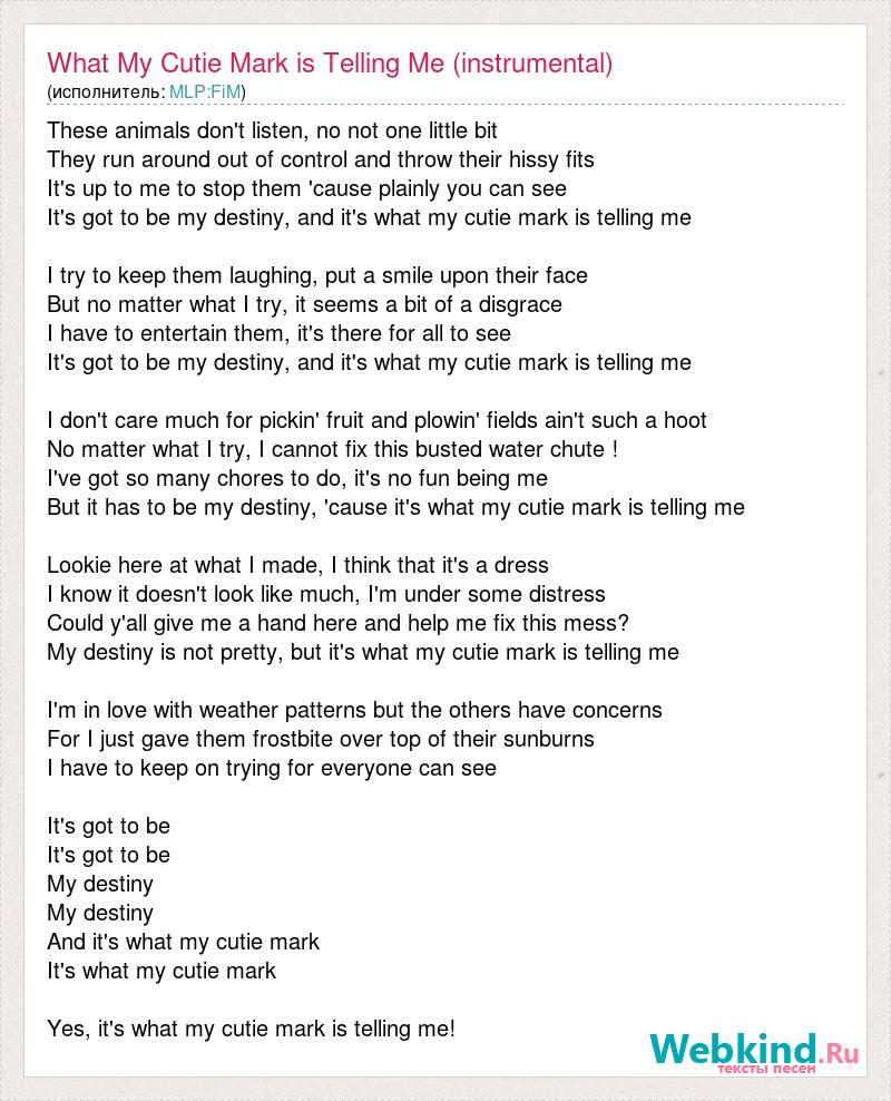 These animals don't listen, no not one little bit They run around out of control and throw their hissy fits It's up to me to stop them 'cause plainly you can see It's got to be my destiny, and it's what my cutie mark is telling me I try to keep them laughing, put a smile upon their face But no matter what I try, it seems a bit of a disgrace I have to entertain them, it's there for all to see It's got to be my destiny, and it's what my cutie mark is telling me I don't care much for pickin' fruit and plowin' fields ain't such a hoot No matter what I try, I cannot fix this busted water chute ! I've got so many chores to do, it's no fun being me But it has to be my destiny, 'cause it's what my cutie mark is telling me Lookie here at what I made, I think that it's a dress I know it doesn't look like much, I'm under some distress Could y'all give me a hand here and help me fix this mess? My destiny is not pretty, but it's what my cutie mark is telling me I'm in love with weather patterns but the others have concerns For I just gave them frostbite over top of their sunburns I have to keep on trying for everyone can see It's got to be It's got to be My destiny My destiny And it's what my cutie mark It's what my cutie mark Yes, it's what my cutie mark is telling me!