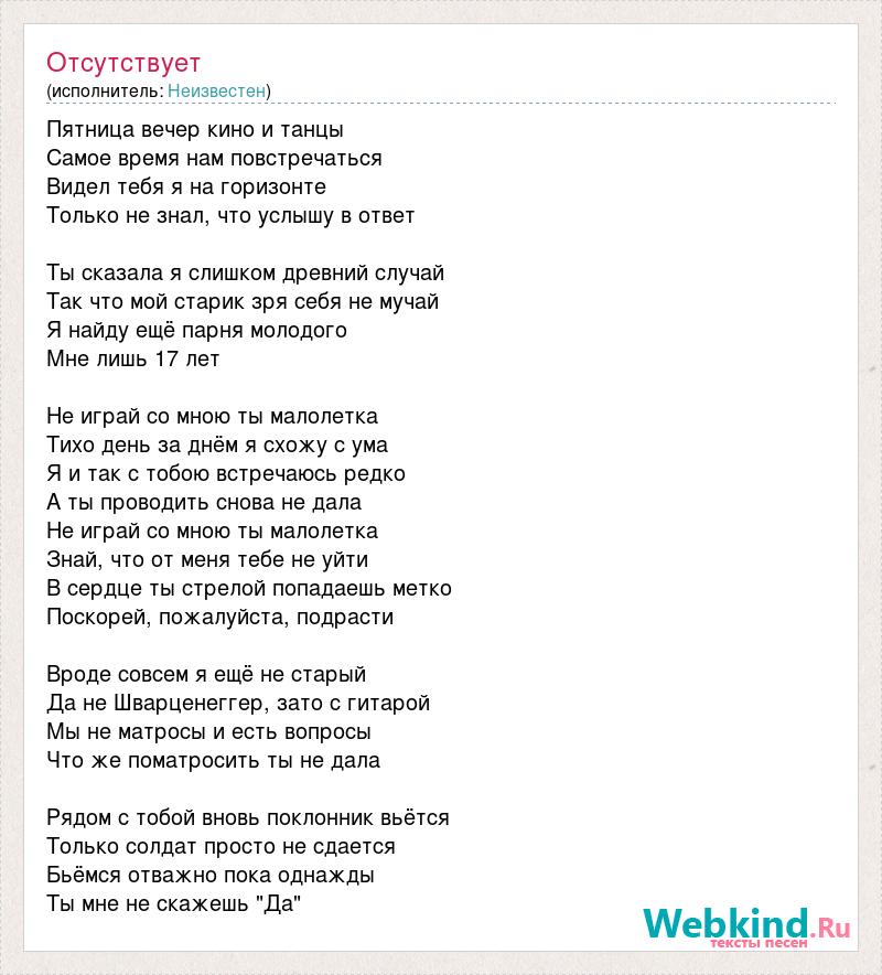 Пятница вечер кино и танцы Самое время нам повстречаться Видел тебя я на горизонте Только не знал, что услышу в ответ Ты сказала я слишком древний случай Так что мой старик зря себя не мучай Я найду ещё парня молодого Мне лишь 17 лет Не играй со мною ты малолетка Тихо день за днём я схожу с ума Я и так с тобою встречаюсь редко А ты проводить снова не дала Не играй со мною ты малолетка Знай, что от меня тебе не уйти В сердце ты стрелой попадаешь метко Поскорей, пожалуйста, подрасти Вроде совсем я ещё не старый Да не Шварценеггер, зато с гитарой Мы не матросы и есть вопросы Что же поматросить ты не дала Рядом с тобой вновь поклонник вьётся Только солдат просто не сдается Бьёмся отважно пока однажды Ты мне не скажешь "Да"