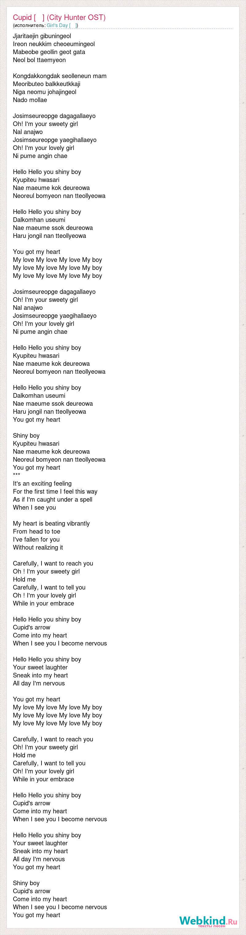Jjaritaejin gibuningeol Ireon neukkim cheoeumingeol Mabeobe geollin geot gata Neol bol ttaemyeon Kongdakkongdak seolleneun mam Meoributeo balkkeutkkaji Niga neomu johajingeol Nado mollae Josimseureopge dagagallaeyo Oh! I'm your sweety girl Nal anajwo Josimseureopge yaegihallaeyo Oh! I'm your lovely girl Ni pume angin chae Hello Hello you shiny boy Kyupiteu hwasari Nae maeume kok deureowa Neoreul bomyeon nan tteollyeowa Hello Hello you shiny boy Dalkomhan useumi Nae maeume ssok deureowa Haru jongil nan tteollyeowa You got my heart My love My love My love My boy My love My love My love My boy My love My love My love My boy Josimseureopge dagagallaeyo Oh! I'm your sweety girl Nal anajwo Josimseureopge yaegihallaeyo Oh! I'm your lovely girl Ni pume angin chae Hello Hello you shiny boy Kyupiteu hwasari Nae maeume kok deureowa Neoreul bomyeon nan tteollyeowa Hello Hello you shiny boy Dalkomhan useumi Nae maeume ssok deureowa Haru jongil nan tteollyeowa You got my heart Shiny boy Kyupiteu hwasari Nae maeume kok deureowa Neoreul bomyeon nan tteollyeowa You got my heart *** It's an exciting feeling For the first time I feel this way As if I'm caught under a spell When I see you My heart is beating vibrantly From head to toe I've fallen for you Without realizing it Carefully, I want to reach you Oh ! I'm your sweety girl Hold me Carefully, I want to tell you Oh ! I'm your lovely girl While in your embrace Hello Hello you shiny boy Cupid's arrow Come into my heart When I see you I become nervous Hello Hello you shiny boy Your sweet laughter Sneak into my heart All day I'm nervous You got my heart My love My love My love My boy My love My love My love My boy My love My love My love My boy Carefully, I want to reach you Oh! I'm your sweety girl Hold me Carefully, I want to tell you Oh! I'm your lovely girl While in your embrace Hello Hello you shiny boy Cupid's arrow Come into my heart When I see you I become nervous Hello Hello you shiny boy Your sweet laughter Sneak into my heart All day I'm nervous You got my heart Shiny boy Cupid's arrow Come into my heart When I see you I become nervous You got my heart