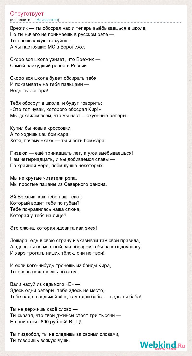 Врежик — ты обосрал нас и теперь выёбываешься в школе, Но ты ничего не понимаешь в русском рэпе — Ты поёшь какую-то хуйню, А мы настоящие MC в Воронеже. Скоро вся школа узнает, что Врежик — Самый наихудший рэпер в России. Скоро вся школа будет обсирать тебя И показывать на тебя пальцами — Ведь ты лошара! Тебя обосрут в школе, и будут говорить: «Это тот чувак, которого обосрал Кир!» Мы докажем всем, что мы наст… охуенные рэперы. Купил бы новые кроссовки, А то ходишь как бомжара. Хотя, почему «как» — ты и есть бомжара. Пиздюк — ещё тринадцать лет, а уже выёбываешься! Нам четырнадцать, и мы добиваемся славы — По крайней мере, поём лучше некоторых. Мы не крутые читатели рэпа, Мы простые пацаны из Северного района. Эй Врежик, как тебе наш текст, Который водит тебе по губам? Тебе понравилась наша слюна, Которая у тебя на лице? Это слюна, которая ядовита как змея! Лошара, едь в свою страну и указывай там свои правила, А здесь ты не местный, мы обосрём тебя на каждом шагу. И харэ трогать наших тёлок, они не твои! И если кого-нибудь тронешь из банды Кира, Ты очень пожалеешь об этом. Вали нахуй из седьмого «Е» — Здесь одни рэперы, тебе здесь не место, Тебе надо в седьмой «Г», там одни бабы — ведь ты баба! Ты не держишь своё слово — Ты сказал, что твои джинсы стоят три тысячи — Но они стоят 890 рублей! В ТЦ! Ты пиздобол, ты не следишь за своими словами, Ты говоришь всякую чушь.