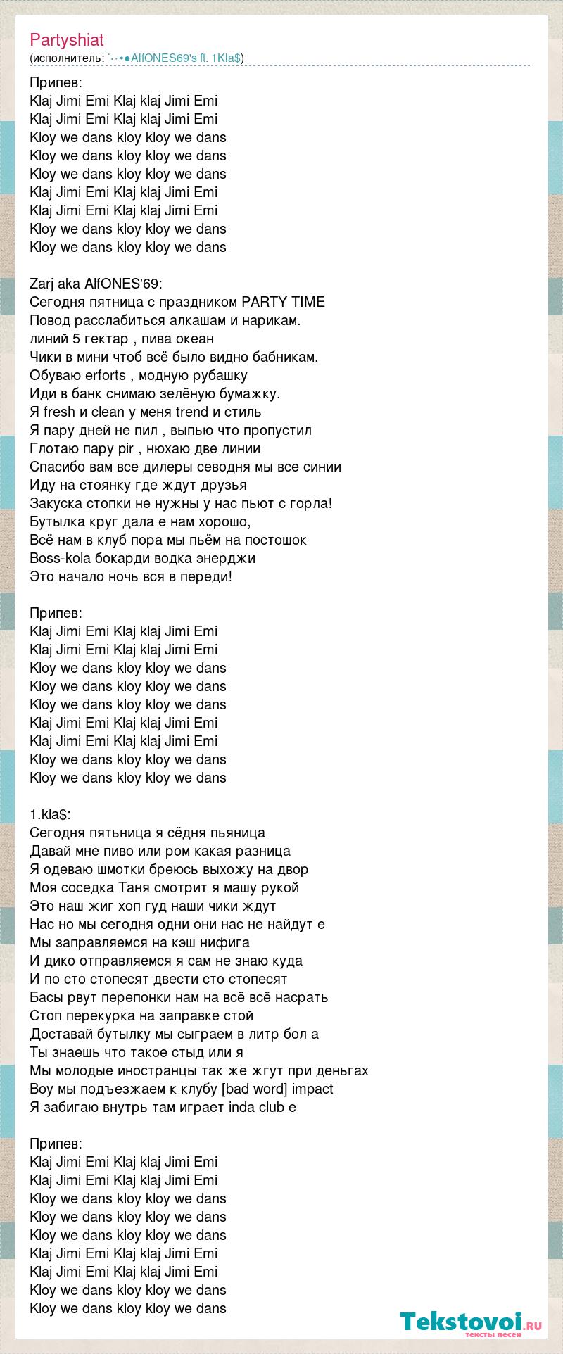 Припев: Klaj Jimi Emi Klaj klaj Jimi Emi Klaj Jimi Emi Klaj klaj Jimi Emi Kloy we dans kloy kloy we dans Kloy we dans kloy kloy we dans Kloy we dans kloy kloy we dans Klaj Jimi Emi Klaj klaj Jimi Emi Klaj Jimi Emi Klaj klaj Jimi Emi Kloy we dans kloy kloy we dans Kloy we dans kloy kloy we dans Zarj aka AlfONES'69: Сегодня пятница с праздником PARTY TIME Повод расслабиться алкашам и нарикам. линий 5 гектар , пива океан Чики в мини чтоб всё было видно бабникам. Обуваю erforts , модную рубашку Иди в банк снимаю зелёную бумажку. Я fresh и clean у меня trend и стиль Я пару дней не пил , выпью что пропустил Глотаю пару pir , нюхаю две линии Спасибо вам все дилеры севодня мы все синии Иду на стоянку где ждут друзья Закуска стопки не нужны у нас пьют с горла! Бутылка круг дала е нам хорошо, Всё нам в клуб пора мы пьём на постошок Вoss-kola бокарди водка энерджи Это начало ночь вся в переди! Припев: Klaj Jimi Emi Klaj klaj Jimi Emi Klaj Jimi Emi Klaj klaj Jimi Emi Kloy we dans kloy kloy we dans Kloy we dans kloy kloy we dans Kloy we dans kloy kloy we dans Klaj Jimi Emi Klaj klaj Jimi Emi Klaj Jimi Emi Klaj klaj Jimi Emi Kloy we dans kloy kloy we dans Kloy we dans kloy kloy we dans 1.kla$: Сегодня пятьница я сёдня пьяница Давай мне пиво или ром какая разница Я одеваю шмотки бреюсь выхожу на двор Моя соседка Таня смотрит я машу рукой Это наш жиг хоп гуд наши чики ждут Нас но мы сегодня одни они нас не найдут е Мы заправляемся на кэш нифига И дико отправляемся я сам не знаю куда И по сто стопесят двести сто стопесят Басы рвут перепонки нам на всё всё насрать Стоп перекурка на заправке стой Доставай бутылку мы сыграем в литр бол а Ты знаешь что такое стыд или я Мы молодые иностранцы так же жгут при деньгах Boy мы подъезжаем к клубу [bad word] impact Я забигаю внутрь там играет inda club е Припев: Klaj Jimi Emi Klaj klaj Jimi Emi Klaj Jimi Emi Klaj klaj Jimi Emi Kloy we dans kloy kloy we dans Kloy we dans kloy kloy we dans Kloy we dans kloy kloy we dans Klaj Jimi Emi Klaj klaj Jimi Emi Klaj Jimi Emi Klaj klaj Jimi Emi Kloy we dans kloy kloy we dans Kloy we dans kloy kloy we dans