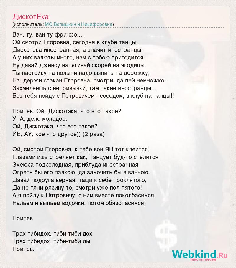 Ван, ту, ван ту фри фо.... Ой смотри Егоровна, сегодня в клубе танцы. Дискотека иностранная, а значит иностранцы. А у них валюты много, нам с тобою пригодится. Ну давай джинсу натягивай скорей на ягодицы. Ты настойку на полыни надо выпить на дорожку, На, держи стакан Егоровна, смотри, да пей немножко. Захмелеешь с непривычки, там такие иностранцы... Без тебя пойду с Петровичем - соседом, в клуб на танцы!! Припев: Ой, Дискотэка, что это такое? У, А, дело молодое.. Ой, Дискотэка, что это такое? ЙЕ, АУ, кое что другое)) (2 раза) Ой, смотри Егоровна, к тебе вон ЯН тот клеится, Глазами ишь стреляет как, Танцует буд-то стелится Змеюка подколодная, приблуда иностранная Огреть бы его палкою, да замочить бы в ванною. Давай подруга верная, тащи к себе проклятого, Да не тяни рязину то, смотри уже пол-пятого! А я пойду к Пятровичу, с ним вместе поколбасимся. Нальем и выпьем водочки, потом обязопасимся) Припев Трах тибидох, тиби-тиби дох Трах тибидох, тиби-тиби ды Припев.