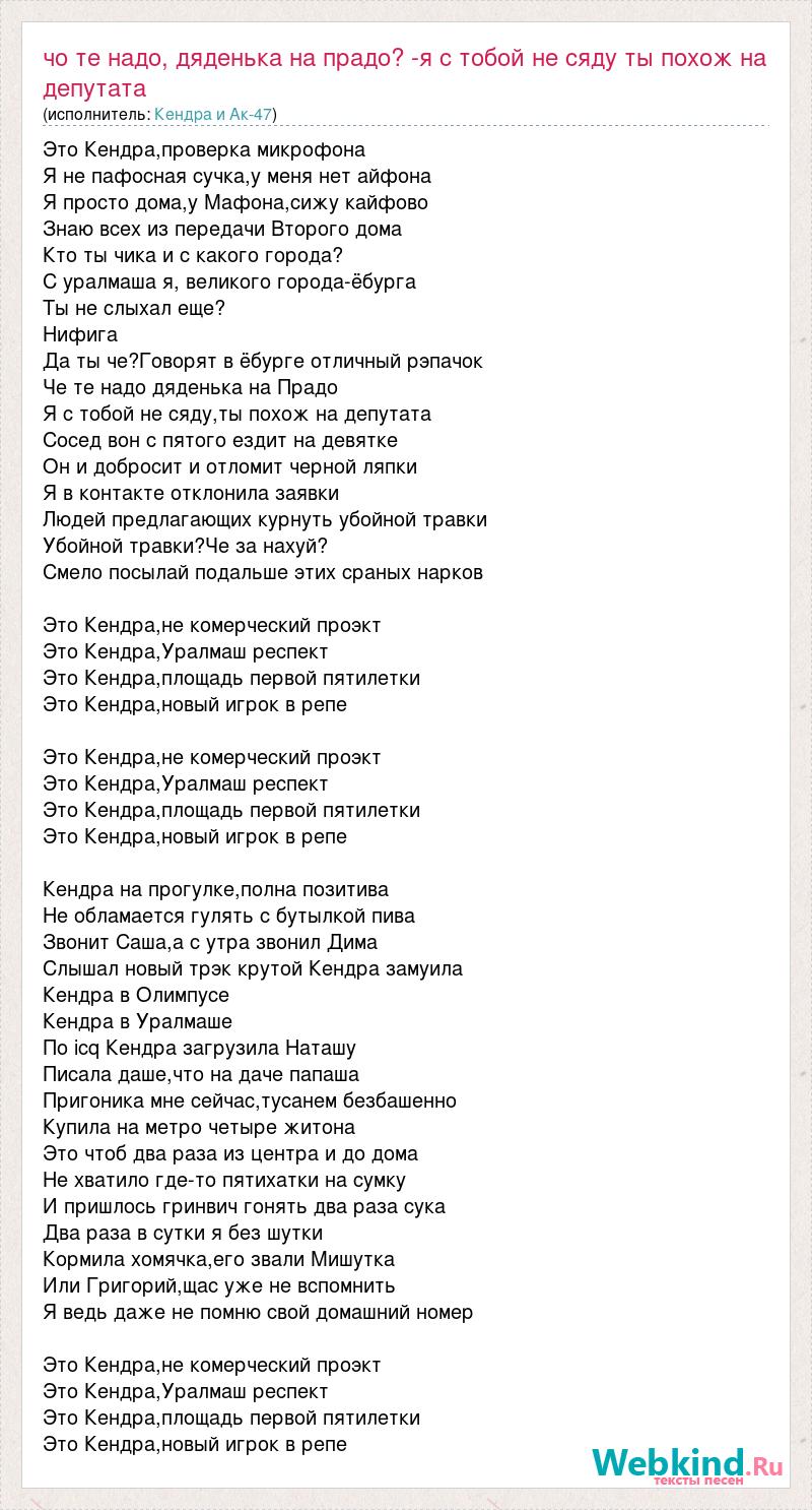 Это Кендра,проверка микрофона Я не пафосная сучка,у меня нет айфона Я просто дома,у Мафона,сижу кайфово Знаю всех из передачи Второго дома Кто ты чика и с какого города? С уралмаша я, великого города-ёбурга Ты не слыхал еще? Нифига Да ты че?Говорят в ёбурге отличный рэпачок Че те надо дяденька на Прадо Я с тобой не сяду,ты похож на депутата Сосед вон с пятого ездит на девятке Он и добросит и отломит черной ляпки Я в контакте отклонила заявки Людей предлагающих курнуть убойной травки Убойной травки?Че за нахуй? Смело посылай подальше этих сраных нарков Это Кендра,не комерческий проэкт Это Кендра,Уралмаш респект Это Кендра,площадь первой пятилетки Это Кендра,новый игрок в репе Это Кендра,не комерческий проэкт Это Кендра,Уралмаш респект Это Кендра,площадь первой пятилетки Это Кендра,новый игрок в репе Кендра на прогулке,полна позитива Не обламается гулять с бутылкой пива Звонит Саша,а с утра звонил Дима Слышал новый трэк крутой Кендра замуила Кендра в Олимпусе Кендра в Уралмаше По icq Кендра загрузила Наташу Писала даше,что на даче папаша Пригоника мне сейчас,тусанем безбашенно Купила на метро четыре житона Это чтоб два раза из центра и до дома Не хватило где-то пятихатки на сумку И пришлось гринвич гонять два раза сука Два раза в сутки я без шутки Кормила хомячка,его звали Мишутка Или Григорий,щас уже не вспомнить Я ведь даже не помню свой домашний номер Это Кендра,не комерческий проэкт Это Кендра,Уралмаш респект Это Кендра,площадь первой пятилетки Это Кендра,новый игрок в репе