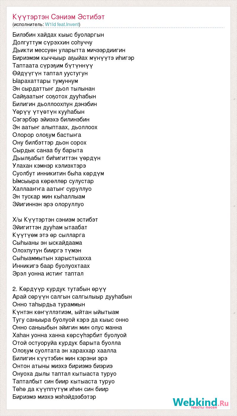 Билэбин хайдах кыыс буоларгын Долгуттум сүрэххин соhуччу Дьикти мессуөн уларытта мичээрдиигин Бириэмэм кыччыыр аҕыйах мүнүүтэ иhигэр Таптаата сүрэҕим бүтүннүү Өйдүүгүн таптал уустугун Ыарахаттары тумуннум Эн сырдаттыҥ дьол тылынан Сайҕаатыҥ соҕотох дууhабын Билигин дьоллоохпун дэнэбин Yөрүү үтүөтүн кууhабын Сэгэрбэр эйиэхэ билинэбин Эн аатыҥ алыптаах, дьоллоох Олорор олоҕум бастыҥа Ону билбэттэр дьон сорох Сырдык санаа бу барыта Дьылҕабыт биhигиттэн үөрдүн Улахан кэмнэр кэлиэхтэрэ Суолбут инникитин быhа көрдүм Ымсыыра көрөллөр сулустар Халлааҥҥа аатыҥ суруллуо Эн тускар мин кыhаллыам Эйигиннэн эрэ олоруллуо Х/ы Күүтэртэн сэниэм эстибэт Эйигиттэн дууhам ытаабат Күүтүөм этэ өр сылларга Сыhыаны эн ыскайдаама Олохпутун бииргэ түмэн Сыhыаммытын харыстыахха Инникигэ баар буолуохтаах Эрэл уонна истиҥ таптал 2. Көрдүүр курдук тутабын өрүү Арай сөрүүн салгын салгылыыр дууhабын Онно таhырдьа тураммын Күнтэн көҥүллэтиэм, ыйтан ыйытыам Тугу саныыра буолуой кэрэ да кыыс онно Онно саныыбын эйигин мин олус манна Хаhан уонна ханна көрсүhэрбит буолуой Отой остуоруйа курдук барыта буолла Олоҕум суолтата эн хараххар хаалла Билигин күүтэбин мин кэрэни эрэ Онтон атыны миэхэ бириэмэ биэриэ Онуоха дылы таптал кытыаста туруо Тапталбыт син биир кытыаста туруо Төhө да күүппүтүм иhин син биир Бириэмэ миэхэ мэhэйдээбэтэр