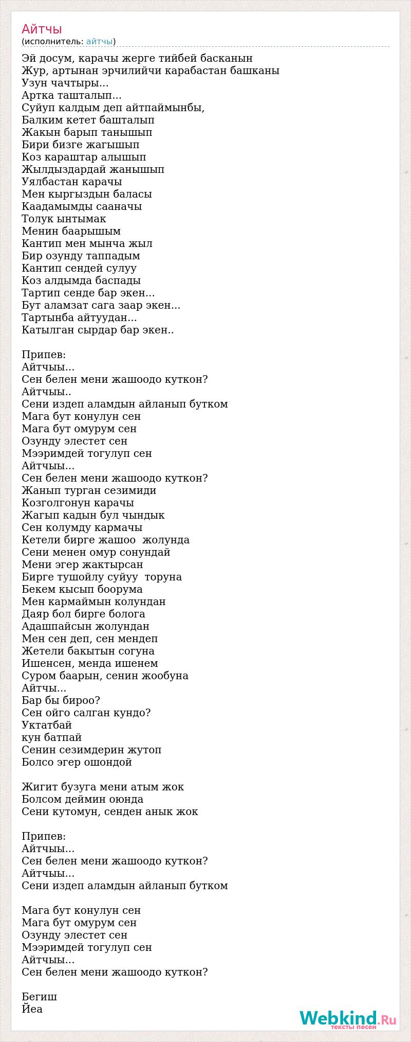 Эй досум, карачы жерге тийбей басканын Жур, артынан эрчилийчи карабастан башканы Узун чачтыры... Артка ташталып... Суйуп калдым деп айтпаймынбы, Балким кетет башталып Жакын барып танышып Бири бизге жагышып Коз караштар алышып Жылдыздардай жанышып Уялбастан карачы Мен кыргыздын баласы Каадамымды сааначы Толук ынтымак Менин баарышым Кантип мен мынча жыл Бир озунду таппадым Кантип сендей сулуу Коз алдымда баспады Тартип сенде бар экен... Бут аламзат сага заар экен... Тартынба айтуудан... Катылган сырдар бар экен.. Припев: Айтчыы... Сен белен мени жашоодо куткон? Айтчыы.. Сени издеп аламдын айланып бутком Мага бут конулун сен Мага бут омурум сен Озунду элестет сен Мээримдей тогулуп сен Айтчыы... Сен белен мени жашоодо куткон? Жанып турган сезимиди Козголгонун карачы Жагып кадын бул чындык Сен колумду кармачы Кетели бирге жашоо жолунда Сени менен омур сонундай Мени эгер жактырсан Бирге тушойлу суйуу торуна Бекем кысып боорума Мен кармаймын колундан Даяр бол бирге болога Адашпайсын жолундан Мен сен деп, сен мендеп Жетели бакытын согуна Ишенсен, менда ишенем Суром баарын, сенин жообуна Айтчы... Бар бы бироо? Сен ойго салган кундо? Уктатбай кун батпай Сенин сезимдерин жутоп Болсо эгер ошондой Жигит бузуга мени атым жок Болсом деймин оюнда Сени кутомун, сенден анык жок Припев: Айтчыы... Сен белен мени жашоодо куткон? Айтчыы... Сени издеп аламдын айланып бутком Мага бут конулун сен Мага бут омурум сен Озунду элестет сен Мээримдей тогулуп сен Айтчыы... Сен белен мени жашоодо куткон? Бегиш Йеа