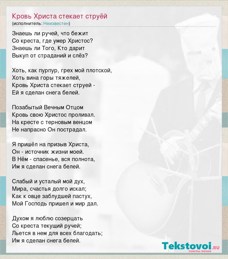 Знаешь ли ручей, что бежит Со креста, где умер Христос? Знаешь ли Того, Кто дарит Выкуп от страданий и слёз? Хоть, как пурпур, грех мой плотской, Хоть вина горы тяжелей, Кровь Христа стекает струей - Ей я сделан снега белей. Позабытый Вечным Отцом Кровь свою Христос проливал. На кресте с терновым венцом Не напрасно Он пострадал. Я пришёл на призыв Христа, Он - источник жизни моей. В Нём - спасенье, вся полнота, Им я сделан снега белей. Слабый и усталый мой дух, Мира, счастья долго искал; Как к овце заблудшей пастух, Мой Господь пришел и мир дал. Духом я люблю созерцать Со креста текущий ручей; Льется в нем для всех благодать; Им я сделан снега белей.