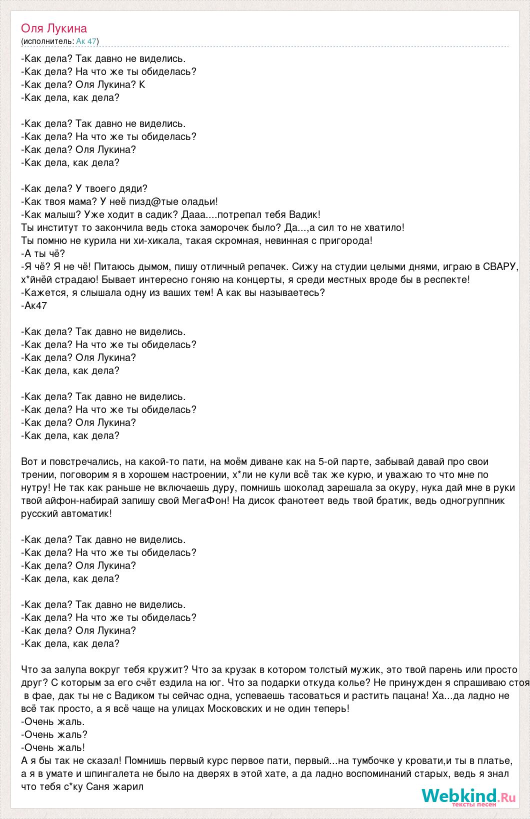 -Как дела? Так давно не виделись. -Как дела? На что же ты обиделась? -Как дела? Оля Лукина? К -Как дела, как дела? -Как дела? Так давно не виделись. -Как дела? На что же ты обиделась? -Как дела? Оля Лукина? -Как дела, как дела? -Как дела? У твоего дяди? -Как твоя мама? У неё пизд@тые оладьи! -Как малыш? Уже ходит в садик? Дааа....потрепал тебя Вадик! Ты институт то закончила ведь стока заморочек было? Да...,а сил то не хватило! Ты помню не курила ни хи-хикала, такая скромная, невинная с пригорода! -А ты чё? -Я чё? Я не чё! Питаюсь дымом, пишу отличный репачек. Сижу на студии целыми днями, играю в СВАРУ, х*йнёй страдаю! Бывает интересно гоняю на концерты, я среди местных вроде бы в респекте! -Кажется, я слышала одну из ваших тем! А как вы называетесь? -Ак47 -Как дела? Так давно не виделись. -Как дела? На что же ты обиделась? -Как дела? Оля Лукина? -Как дела, как дела? -Как дела? Так давно не виделись. -Как дела? На что же ты обиделась? -Как дела? Оля Лукина? -Как дела, как дела? Вот и повстречались, на какой-то пати, на моём диване как на 5-ой парте, забывай давай про свои трении, поговорим я в хорошем настроении, х*ли не кули всё так же курю, и уважаю то что мне по нутру! Не так как раньше не включаешь дуру, помнишь шоколад зарешала за окуру, нука дай мне в руки твой айфон-набирай запишу свой МегаФон! На дисок фанотеет ведь твой братик, ведь одногруппник русский автоматик! -Как дела? Так давно не виделись. -Как дела? На что же ты обиделась? -Как дела? Оля Лукина? -Как дела, как дела? -Как дела? Так давно не виделись. -Как дела? На что же ты обиделась? -Как дела? Оля Лукина? -Как дела, как дела? Что за залупа вокруг тебя кружит? Что за крузак в котором толстый мужик, это твой парень или просто друг? С которым за его счёт ездила на юг. Что за подарки откуда колье? Не принужден я спрашиваю стоя в фае, дак ты не с Вадиком ты сейчас одна, успеваешь тасоваться и растить пацана! Ха...да ладно не всё так просто, а я всё чаще на улицах Московских и не один теперь! -Очень жаль. -Очень жаль? -Очень жаль! А я бы так не сказал! Помнишь первый курс первое пати, первый...на тумбочке у кровати,и ты в платье, а я в умате и шпингалета не было на дверях в этой хате, а да ладно воспоминаний старых, ведь я знал что тебя с*ку Саня жарил