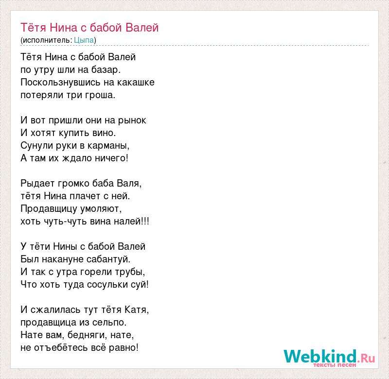Тётя Нина с бабой Валей по утру шли на базар. Поскользнувшись на какашке потеряли три гроша. И вот пришли они на рынок И хотят купить вино. Сунули руки в карманы, А там их ждало ничего! Рыдает громко баба Валя, тётя Нина плачет с ней. Продавщицу умоляют, хоть чуть-чуть вина налей!!! У тёти Нины с бабой Валей Был накануне сабантуй. И так с утра горели трубы, Что хоть туда сосульки суй! И сжалилась тут тётя Катя, продавщица из сельпо. Нате вам, бедняги, нате, не отъебётесь всё равно!