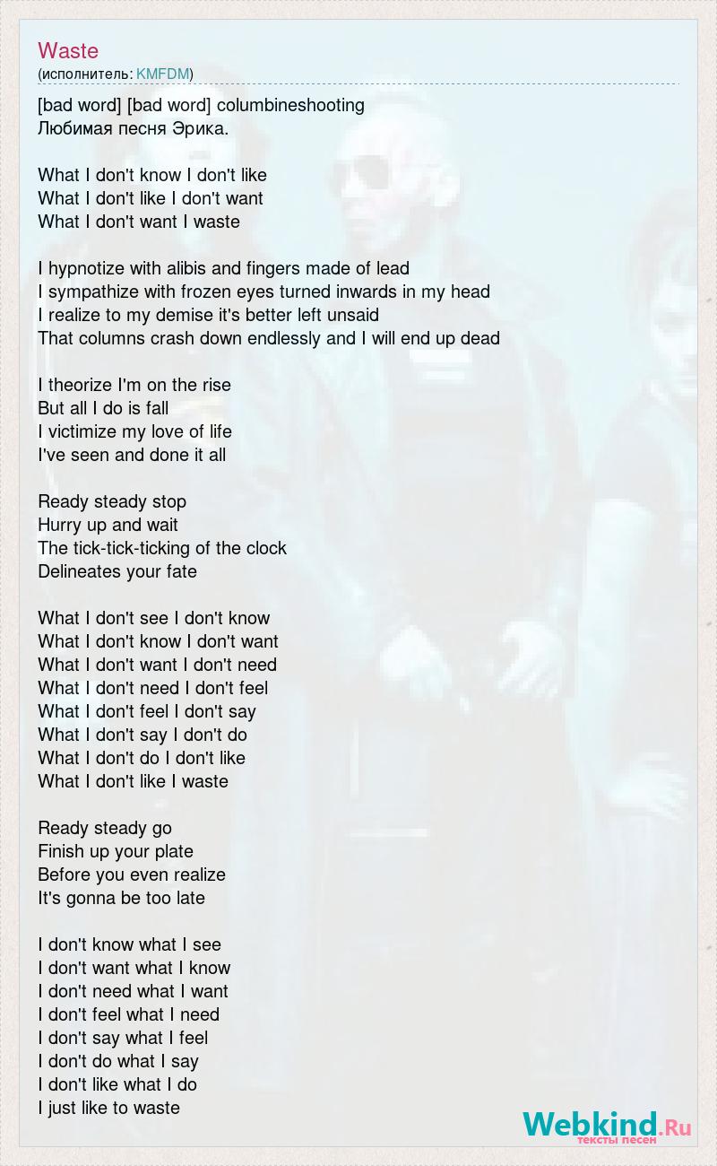 [bad word] [bad word] columbineshooting Любимая песня Эрика. What I don't know I don't like What I don't like I don't want What I don't want I waste I hypnotize with alibis and fingers made of lead I sympathize with frozen eyes turned inwards in my head I realize to my demise it's better left unsaid That columns crash down endlessly and I will end up dead I theorize I'm on the rise But all I do is fall I victimize my love of life I've seen and done it all Ready steady stop Hurry up and wait The tick-tick-ticking of the clock Delineates your fate What I don't see I don't know What I don't know I don't want What I don't want I don't need What I don't need I don't feel What I don't feel I don't say What I don't say I don't do What I don't do I don't like What I don't like I waste Ready steady go Finish up your plate Before you even realize It's gonna be too late I don't know what I see I don't want what I know I don't need what I want I don't feel what I need I don't say what I feel I don't do what I say I don't like what I do I just like to waste