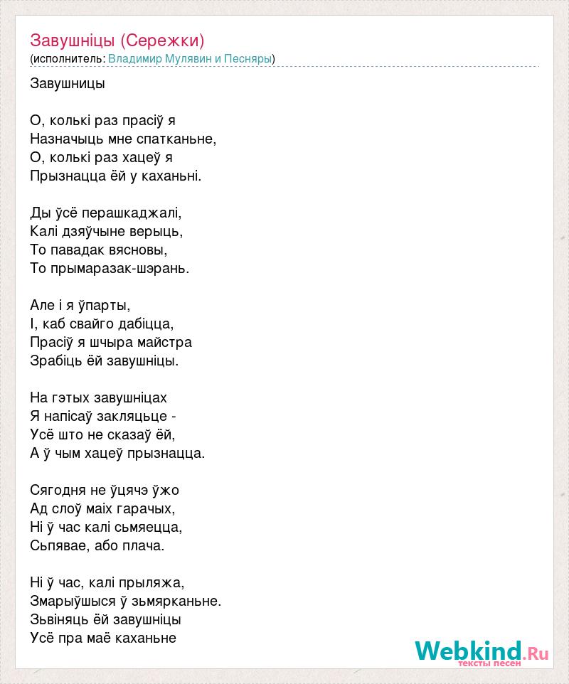 Завушницы О, колькі раз прасіў я Назначыць мне спатканьне, О, колькі раз хацеў я Прызнацца ёй у каханьні. Ды ўсё перашкаджалі, Калі дзяўчыне верыць, То павадак вясновы, То прымаразак-шэрань. Але і я ўпарты, І, каб свайго дабіцца, Прасіў я шчыра майстра Зрабіць ёй завушніцы. На гэтых завушніцах Я напісаў закляцьце - Усё што не сказаў ёй, А ў чым хацеў прызнацца. Сягодня не ўцячэ ўжо Ад слоў маіх гарачых, Ні ў час калі сьмяецца, Сьпявае, або плача. Ні ў час, калі прыляжа, Змарыўшыся ў зьмярканьне. Зьвіняць ёй завушніцы Усё пра маё каханьне