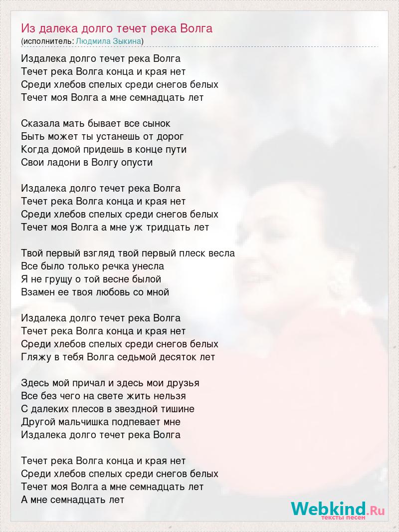 Издалека долго течет река Волга Течет река Волга конца и края нет Среди хлебов спелых среди снегов белых Течет моя Волга а мне семнадцать лет Сказала мать бывает все сынок Быть может ты устанешь от дорог Когда домой придешь в конце пути Свои ладони в Волгу опусти Издалека долго течет река Волга Течет река Волга конца и края нет Среди хлебов спелых среди снегов белых Течет моя Волга а мне уж тридцать лет Твой первый взгляд твой первый плеск весла Все было только речка унесла Я не грущу о той весне былой Взамен ее твоя любовь со мной Издалека долго течет река Волга Течет река Волга конца и края нет Среди хлебов спелых среди снегов белых Гляжу в тебя Волга седьмой десяток лет Здесь мой причал и здесь мои друзья Все без чего на свете жить нельзя С далеких плесов в звездной тишине Другой мальчишка подпевает мне Издалека долго течет река Волга Течет река Волга конца и края нет Среди хлебов спелых среди снегов белых Течет моя Волга а мне семнадцать лет А мне семнадцать лет