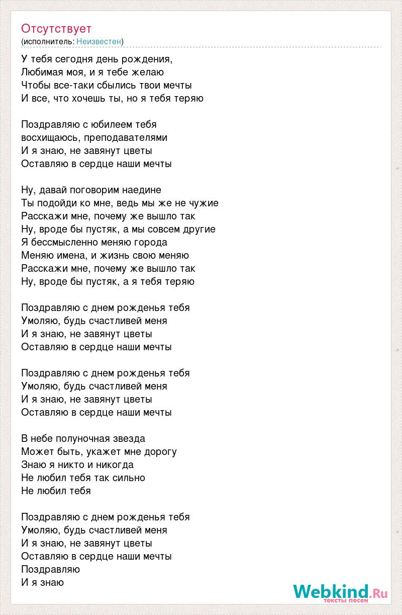 У тебя сегодня день рождения, Любимая моя, и я тебе желаю Чтобы все-таки сбылись твои мечты И все, что хочешь ты, но я тебя теряю Поздравляю с юбилеем тебя восхищаюсь, преподавателями И я знаю, не завянут цветы Оставляю в сердце наши мечты Ну, давай поговорим наедине Ты подойди ко мне, ведь мы же не чужие Расскажи мне, почему же вышло так Ну, вроде бы пустяк, а мы совсем другие Я бессмысленно меняю города Меняю имена, и жизнь свою меняю Расскажи мне, почему же вышло так Ну, вроде бы пустяк, а я тебя теряю Поздравляю с днем рожденья тебя Умоляю, будь счастливей меня И я знаю, не завянут цветы Оставляю в сердце наши мечты Поздравляю с днем рожденья тебя Умоляю, будь счастливей меня И я знаю, не завянут цветы Оставляю в сердце наши мечты В небе полуночная звезда Может быть, укажет мне дорогу Знаю я никто и никогда Не любил тебя так сильно Не любил тебя Поздравляю с днем рожденья тебя Умоляю, будь счастливей меня И я знаю, не завянут цветы Оставляю в сердце наши мечты Поздравляю И я знаю