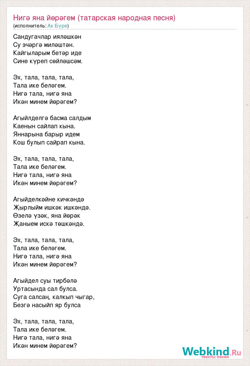 Сандугачлар ияләшкән Су эчәргә миләштән. Кайгыларым бетәр иде Сине күреп сөйләшсәм. Эх, тала, тала, тала, Тала ике беләгем. Нигә тала, нигә яна Икән минем йөрәгем? Агыйлделгә басма салдым Каенын сайлап кына. Яннарына барыр идем Кош булып сайрап кына. Эх, тала, тала, тала, Тала ике беләгем. Нигә тала, нигә яна Икән минем йөрәгем? Агыйделкәйне кичкәндә Җырлыйм ишкәк ишкәндә. Өзелә үзәк, яна йөрәк Җаныем искә төшкәндә. Эх, тала, тала, тала, Тала ике беләгем. Нигә тала, нигә яна Икән минем йөрәгем? Агыйдел суы тирбәлә Уртасында сал булса. Суга салсаң, калкып чыгар, Безгә насыйп яр булса Эх, тала, тала, тала, Тала ике беләгем. Нигә тала, нигә яна Икән минем йөрәгем?