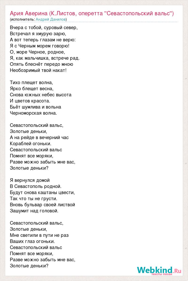 Вчера с тобой, суровый север, Встречал я хмурую зарю, А вот теперь глазам не верю: Я с Черным морем говорю! О, море Черное, родное, Я, как мальчишка, встрече рад. Опять блеснёт передо мною Необозримый твой накат! Тихо плещет волна, Ярко блещет весна, Снова южных небес высота И цветов красота. Бьёт шумлива и вольна Черноморская волна. Севастопольский вальс, Золотые деньки, А на рейде в вечерний час Кораблей огоньки. Севастопольский вальс Помнят все моряки, Разве можно забыть мне вас, Золотые деньки? Я вернулся домой В Севастополь родной. Будут снова каштаны цвести, Так что ты не грусти. Вновь бульвар своей листвой Зашумит над головой. Севастопольский вальс, Золотые деньки, Мне светили в пути не раз Ваших глаз огоньки. Севастопольский вальс Помнят все моряки, Разве можно забыть мне вас, Золотые деньки?