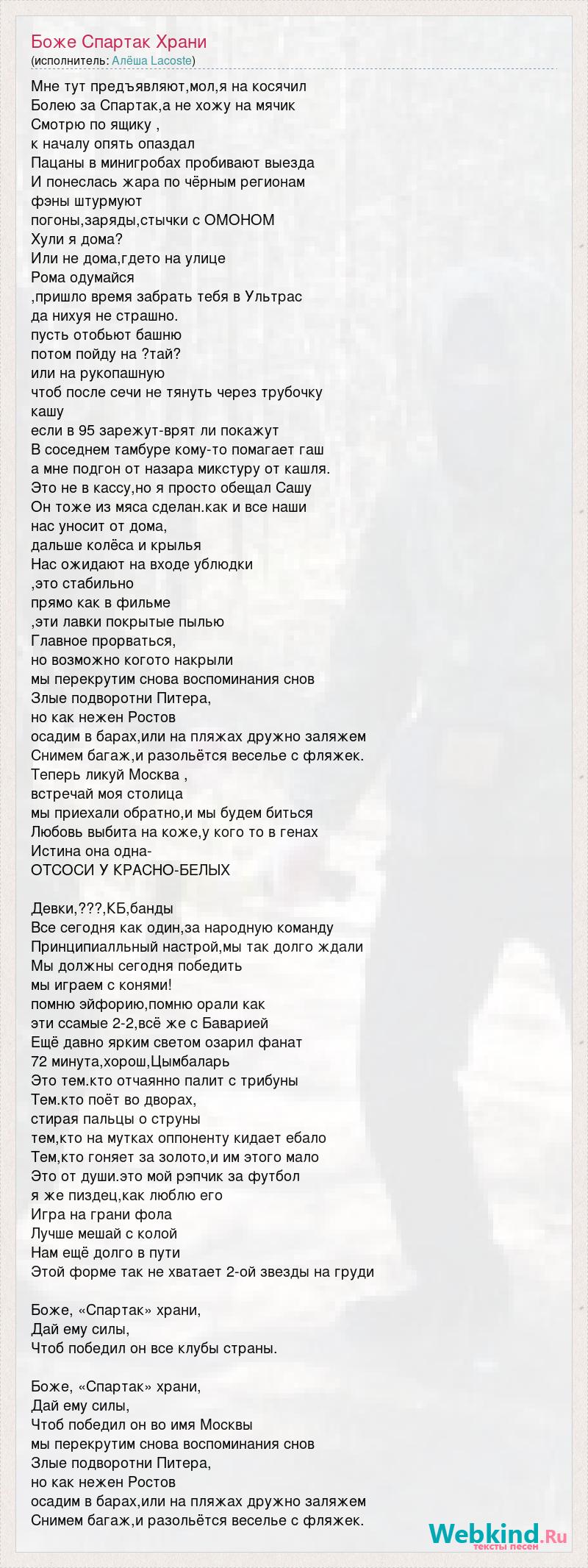 Мне тут предъявляют,мол,я на косячил Болею за Спартак,а не хожу на мячик Смотрю по ящику , к началу опять опаздал Пацаны в минигробах пробивают выезда И понеслась жара по чёрным регионам фэны штурмуют погоны,заряды,стычки с ОМОНОМ Хули я дома? Или не дома,гдето на улице Рома одумайся ,пришло время забрать тебя в Ультрас да нихуя не страшно. пусть отобьют башню потом пойду на ?тай? или на рукопашную чтоб после сечи не тянуть через трубочку кашу если в 95 зарежут-врят ли покажут В соседнем тамбуре кому-то помагает гаш а мне подгон от назара микстуру от кашля. Это не в кассу,но я просто обещал Сашу Он тоже из мяса сделан.как и все наши нас уносит от дома, дальше колёса и крылья Нас ожидают на входе ублюдки ,это стабильно прямо как в фильме ,эти лавки покрытые пылью Главное прорваться, но возможно когото накрыли мы перекрутим снова воспоминания снов Злые подворотни Питера, но как нежен Ростов осадим в барах,или на пляжах дружно заляжем Снимем багаж,и разольётся веселье с фляжек. Теперь ликуй Москва , встречай моя столица мы приехали обратно,и мы будем биться Любовь выбита на коже,у кого то в генах Истина она одна- ОТСОСИ У КРАСНО-БЕЛЫХ Девки,???,КБ,банды Все сегодня как один,за народную команду Принципиалльный настрой,мы так долго ждали Мы должны сегодня победить мы играем с конями! помню эйфорию,помню орали как эти ссамые 2-2,всё же с Баварией Ещё давно ярким светом озарил фанат 72 минута,хорош,Цымбаларь Это тем.кто отчаянно палит с трибуны Тем.кто поёт во дворах, стирая пальцы о струны тем,кто на мутках оппоненту кидает ебало Тем,кто гоняет за золото,и им этого мало Это от души.это мой рэпчик за футбол я же пиздец,как люблю его Игра на грани фола Лучше мешай с колой Нам ещё долго в пути Этой форме так не хватает 2-ой звезды на груди Боже, «Cпартак» храни, Дай ему силы, Чтоб победил он все клубы страны. Боже, «Спартак» храни, Дай ему силы, Чтоб победил он во имя Москвы мы перекрутим снова воспоминания снов Злые подворотни Питера, но как нежен Ростов осадим в барах,или на пляжах дружно заляжем Снимем багаж,и разольётся веселье с фляжек.