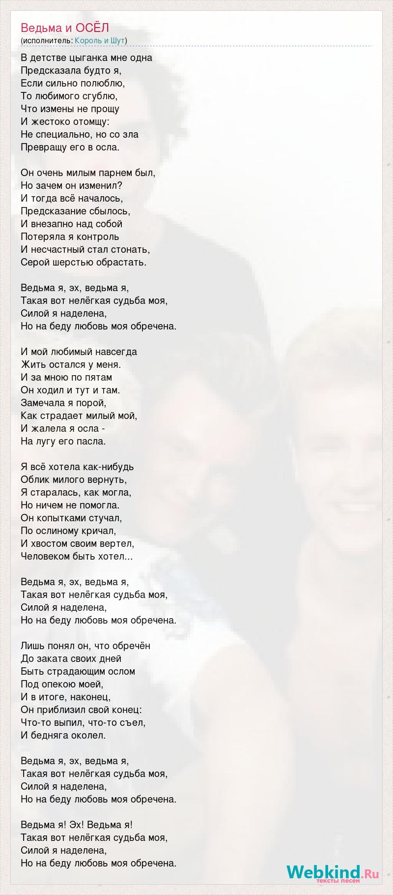 В детстве цыганка мне одна Предсказала будто я, Если сильно полюблю, То любимого сгублю, Что измены не прощу И жестоко отомщу: Не специально, но со зла Превращу его в осла. Он очень милым парнем был, Но зачем он изменил? И тогда всё началось, Предсказание сбылось, И внезапно над собой Потеряла я контроль И несчастный стал стонать, Серой шерстью обрастать. Ведьма я, эх, ведьма я, Такая вот нелёгкая судьба моя, Силой я наделена, Но на беду любовь моя обречена. И мой любимый навсегда Жить остался у меня. И за мною по пятам Он ходил и тут и там. Замечала я порой, Как страдает милый мой, И жалела я осла - На лугу его пасла. Я всё хотела как-нибудь Облик милого вернуть, Я старалась, как могла, Но ничем не помогла. Он копытками стучал, По ослиному кричал, И хвостом своим вертел, Человеком быть хотел... Ведьма я, эх, ведьма я, Такая вот нелёгкая судьба моя, Силой я наделена, Но на беду любовь моя обречена. Лишь понял он, что обречён До заката своих дней Быть страдающим ослом Под опекою моей, И в итоге, наконец, Он приблизил свой конец: Что-то выпил, что-то съел, И бедняга околел. Ведьма я, эх, ведьма я, Такая вот нелёгкая судьба моя, Силой я наделена, Но на беду любовь моя обречена. Ведьма я! Эх! Ведьма я! Такая вот нелёгкая судьба моя, Силой я наделена, Но на беду любовь моя обречена.