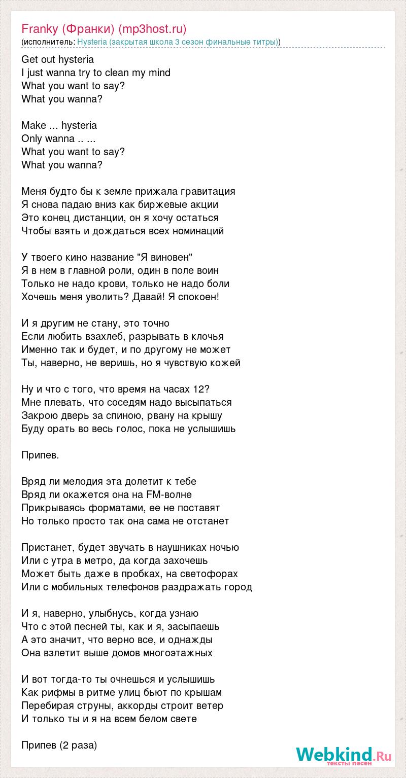 Get out hysteria I just wanna try to clean my mind What you want to say? What you wanna? Make ... hysteria Only wanna .. ... What you want to say? What you wanna? Меня будто бы к земле прижала гравитация Я снова падаю вниз как биржевые акции Это конец дистанции, он я хочу остаться Чтобы взять и дождаться всех номинаций У твоего кино название "Я виновен" Я в нем в главной роли, один в поле воин Только не надо крови, только не надо боли Хочешь меня уволить? Давай! Я спокоен! И я другим не стану, это точно Если любить взахлеб, разрывать в клочья Именно так и будет, и по другому не может Ты, наверно, не веришь, но я чувствую кожей Ну и что с того, что время на часах 12? Мне плевать, что соседям надо высыпаться Закрою дверь за спиною, рвану на крышу Буду орать во весь голос, пока не услышишь Припев. Вряд ли мелодия эта долетит к тебе Вряд ли окажется она на FM-волне Прикрываясь форматами, ее не поставят Но только просто так она сама не отстанет Пристанет, будет звучать в наушниках ночью Или с утра в метро, да когда захочешь Может быть даже в пробках, на светофорах Или с мобильных телефонов раздражать город И я, наверно, улыбнусь, когда узнаю Что с этой песней ты, как и я, засыпаешь А это значит, что верно все, и однажды Она взлетит выше домов многоэтажных И вот тогда-то ты очнешься и услышишь Как рифмы в ритме улиц бьют по крышам Перебирая струны, аккорды строит ветер И только ты и я на всем белом свете Припев (2 раза)