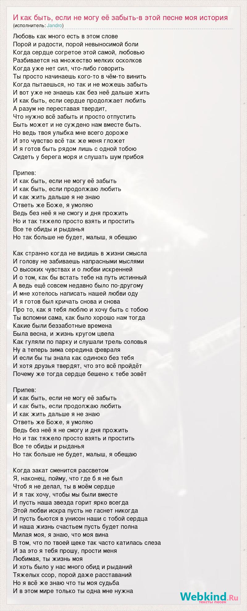 Любовь как много есть в этом слове Порой и радости, порой невыносимой боли Когда сердце согретое этой самой, любовью Разбивается на множество мелких осколков Когда уже нет сил, что-либо говорить Ты просто начинаешь кого-то в чём-то винить Когда пытаешься, но так и не можешь забыть И вот уже не знаешь как без неё дальше жить И как быть, если сердце продолжает любить А разум не переставая твердит, Что нужно всё забыть и просто отпустить Быть может и не суждено нам вместе быть. Но ведь твоя улыбка мне всего дороже И это чувство всё так же меня гложет И я готов быть рядом лишь с одной тобою Сидеть у берега моря и слушать шум прибоя Припев: И как быть, если не могу её забыть И как быть, если продолжаю любить И как жить дальше я не знаю Ответь же Боже, я умоляю Ведь без неё я не смогу и дня прожить Но и так тяжело просто взять и простить Все те обиды и рыданья Но так больше не будет, малыш, я обещаю Как странно когда не видишь в жизни смысла И голову не забиваешь напрасными мыслями О высоких чувствах и о любви искренней И о том, как бы встать тебе на путь истинный А ведь ещё совсем недавно было по-другому И мне хотелось написать нашей любви оду И я готов был кричать снова и снова Про то, как я тебя люблю и хочу быть с тобою Ты вспомни сама, как было хорошо нам тогда Какие были беззаботные времена Была весна, и жизнь кругом цвела Как гуляли по парку и слушали трель соловья Ну а теперь зима середина февраля И если бы ты знала как одиноко без тебя И хотя друзья твердят, что это всё пройдёт Почему же тогда сердце бешено к тебе зовёт Припев: И как быть, если не могу её забыть И как быть, если продолжаю любить И как жить дальше я не знаю Ответь же Боже, я умоляю Ведь без неё я не смогу и дня прожить Но и так тяжело просто взять и простить Все те обиды и рыданья Но так больше не будет, малыш, я обещаю Когда закат сменится рассветом Я, наконец, пойму, что где б я не был Чтоб я не делал, ты в моём сердце И я так хочу, чтобы мы были вместе И пусть наша звезда горит ярко всегда Этой любви искра пусть не гаснет никогда И пусть бьются в унисон наши с тобой сердца И наша жизнь счастьем пусть будет полна Милая моя, я знаю, что моя вина В том, что по твоей щеке так часто катилась слеза И за это я тебя прошу, прости меня Любимая, ты жизнь моя И хоть было у нас много обид и рыданий Тяжелых ссор, порой даже расставаний Но я всё же знаю что ты моя судьба И в этом мире только ты одна мне нужна