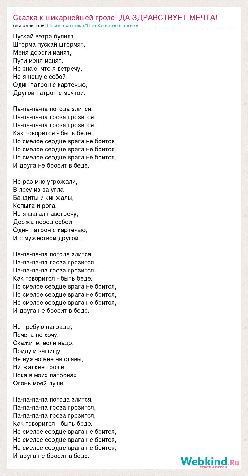 Пускай ветра буянят, Шторма пускай штормят, Меня дороги манят, Пути меня манят. Не знаю, что я встречу, Но я ношу с собой Один патрон с картечью, Другой патрон с мечтой. Па-па-па-па погода злится, Па-па-па-па гроза грозится, Па-па-па-па гроза грозится, Как говорится - быть беде. Но смелое сердце врага не боится, Но смелое сердце врага не боится, Но смелое сердце врага не боится, И друга не бросит в беде. Не раз мне угрожали, В лесу из-за угла Бандиты и кинжалы, Копыта и рога. Но я шагал навстречу, Держа перед собой Один патрон с картечью, И с мужеством другой. Па-па-па-па погода злится, Па-па-па-па гроза грозится, Па-па-па-па гроза грозится, Как говорится - быть беде. Но смелое сердце врага не боится, Но смелое сердце врага не боится, Но смелое сердце врага не боится, И друга не бросит в беде. Не требую награды, Почета не хочу, Скажите, если надо, Приду и защищу. Не нужно мне ни славы, Ни жалкие гроши, Пока в моих патронах Огонь моей души. Па-па-па-па погода злится, Па-па-па-па гроза грозится, Па-па-па-па гроза грозится, Как говорится - быть беде. Но смелое сердце врага не боится, Но смелое сердце врага не боится, Но смелое сердце врага не боится, И друга не бросит в беде.
