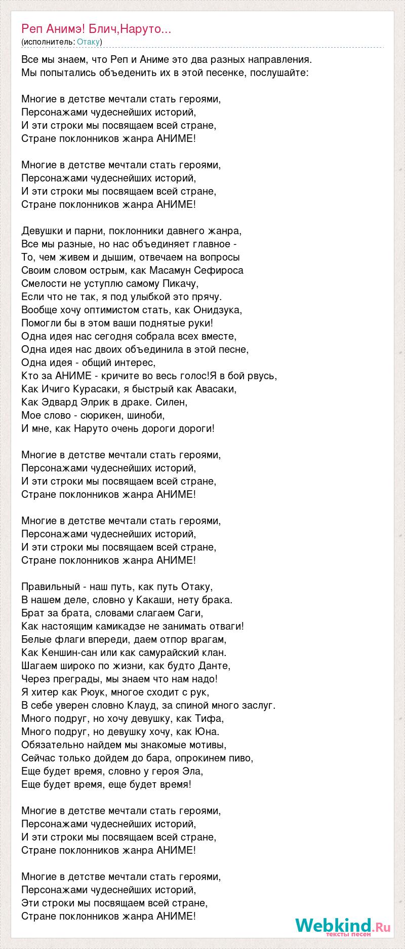 Все мы знаем, что Реп и Аниме это два разных направления. Мы попытались объеденить их в этой песенке, послушайте: Многие в детстве мечтали стать героями, Персонажами чудеснейших историй, И эти строки мы посвящаем всей стране, Стране поклонников жанра АНИМЕ! Многие в детстве мечтали стать героями, Персонажами чудеснейших историй, И эти строки мы посвящаем всей стране, Стране поклонников жанра АНИМЕ! Девушки и парни, поклонники давнего жанра, Все мы разные, но нас объединяет главное - То, чем живем и дышим, отвечаем на вопросы Своим словом острым, как Масамун Сефироса Смелости не уступлю самому Пикачу, Если что не так, я под улыбкой это прячу. Вообще хочу оптимистом стать, как Онидзука, Помогли бы в этом ваши поднятые руки! Одна идея нас сегодня собрала всех вместе, Одна идея нас двоих объединила в этой песне, Одна идея - общий интерес, Кто за АНИМЕ - кричите во весь голос!Я в бой рвусь, Как Ичиго Курасаки, я быстрый как Авасаки, Как Эдвард Элрик в драке. Силен, Мое слово - сюрикен, шиноби, И мне, как Наруто очень дороги дороги! Многие в детстве мечтали стать героями, Персонажами чудеснейших историй, И эти строки мы посвящаем всей стране, Стране поклонников жанра АНИМЕ! Многие в детстве мечтали стать героями, Персонажами чудеснейших историй, И эти строки мы посвящаем всей стране, Стране поклонников жанра АНИМЕ! Правильный - наш путь, как путь Отаку, В нашем деле, словно у Какаши, нету брака. Брат за брата, словами слагаем Саги, Как настоящим камикадзе не занимать отваги! Белые флаги впереди, даем отпор врагам, Как Кеншин-сан или как самурайский клан. Шагаем широко по жизни, как будто Данте, Через преграды, мы знаем что нам надо! Я хитер как Рюук, многое сходит с рук, В себе уверен словно Клауд, за спиной много заслуг. Много подруг, но хочу девушку, как Тифа, Много подруг, но девушку хочу, как Юна. Обязательно найдем мы знакомые мотивы, Сейчас только дойдем до бара, опрокинем пиво, Еще будет время, словно у героя Эла, Еще будет время, еще будет время! Многие в детстве мечтали стать героями, Персонажами чудеснейших историй, И эти строки мы посвящаем всей стране, Стране поклонников жанра АНИМЕ! Многие в детстве мечтали стать героями, Персонажами чудеснейших историй, Эти строки мы посвящаем всей стране, Стране поклонников жанра АНИМЕ!