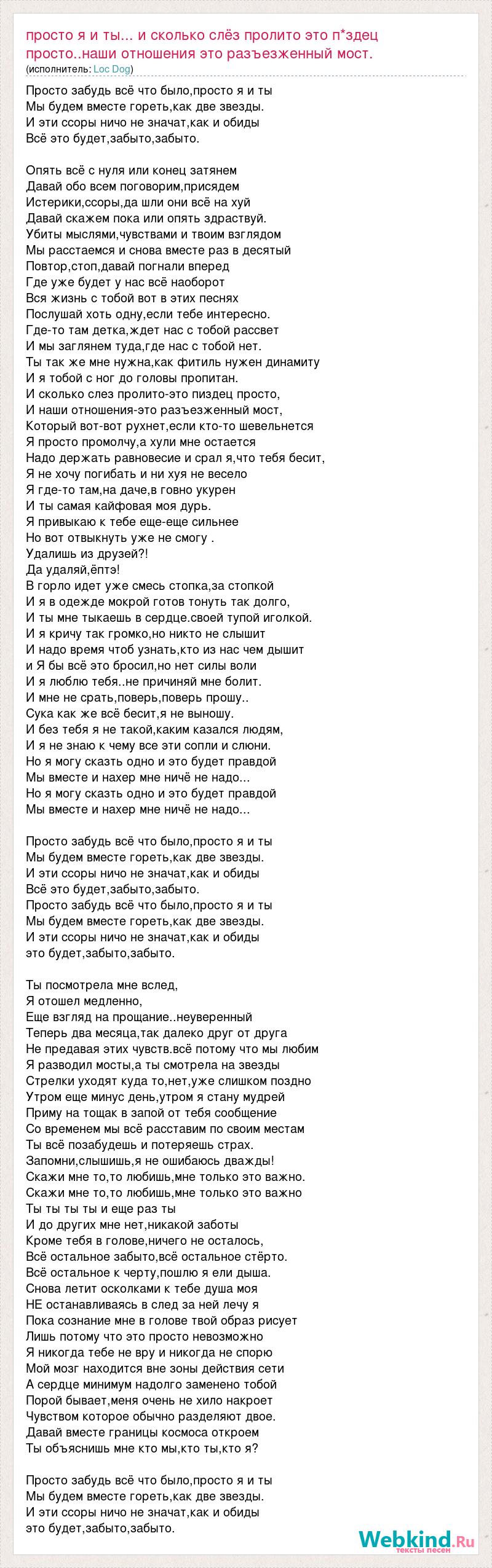 Просто забудь всё что было,просто я и ты Мы будем вместе гореть,как две звезды. И эти ссоры ничо не значат,как и обиды Всё это будет,забыто,забыто. Опять всё с нуля или конец затянем Давай обо всем поговорим,присядем Истерики,ссоры,да шли они всё на хуй Давай скажем пока или опять здраствуй. Убиты мыслями,чувствами и твоим взглядом Мы расстаемся и снова вместе раз в десятый Повтор,стоп,давай погнали вперед Где уже будет у нас всё наоборот Вся жизнь с тобой вот в этих песнях Послушай хоть одну,если тебе интересно. Где-то там детка,ждет нас с тобой рассвет И мы заглянем туда,где нас с тобой нет. Ты так же мне нужна,как фитиль нужен динамиту И я тобой с ног до головы пропитан. И сколько слез пролито-это пиздец просто, И наши отношения-это разъезженный мост, Который вот-вот рухнет,если кто-то шевельнется Я просто промолчу,а хули мне остается Надо держать равновесие и срал я,что тебя бесит, Я не хочу погибать и ни хуя не весело Я где-то там,на даче,в говно укурен И ты самая кайфовая моя дурь. Я привыкаю к тебе еще-еще сильнее Но вот отвыкнуть уже не смогу . Удалишь из друзей?! Да удаляй,ёптэ! В горло идет уже смесь стопка,за стопкой И я в одежде мокрой готов тонуть так долго, И ты мне тыкаешь в сердце.своей тупой иголкой. И я кричу так громко,но никто не слышит И надо время чтоб узнать,кто из нас чем дышит и Я бы всё это бросил,но нет силы воли И я люблю тебя..не причиняй мне болит. И мне не срать,поверь,поверь прошу.. Сука как же всё бесит,я не выношу. И без тебя я не такой,каким казался людям, И я не знаю к чему все эти сопли и слюни. Но я могу сказть одно и это будет правдой Мы вместе и нахер мне ничё не надо... Но я могу сказть одно и это будет правдой Мы вместе и нахер мне ничё не надо... Просто забудь всё что было,просто я и ты Мы будем вместе гореть,как две звезды. И эти ссоры ничо не значат,как и обиды Всё это будет,забыто,забыто. Просто забудь всё что было,просто я и ты Мы будем вместе гореть,как две звезды. И эти ссоры ничо не значат,как и обиды это будет,забыто,забыто. Ты посмотрела мне вслед, Я отошел медленно, Еще взгляд на прощание..неуверенный Теперь два месяца,так далеко друг от друга Не предавая этих чувств.всё потому что мы любим Я разводил мосты,а ты смотрела на звезды Стрелки уходят куда то,нет,уже слишком поздно Утром еще минус день,утром я стану мудрей Приму на тощак в запой от тебя сообщение Со временем мы всё расставим по своим местам Ты всё позабудешь и потеряешь страх. Запомни,слышишь,я не ошибаюсь дважды! Скажи мне то,то любишь,мне только это важно. Скажи мне то,то любишь,мне только это важно Ты ты ты ты и еще раз ты И до других мне нет,никакой заботы Кроме тебя в голове,ничего не осталось, Всё остальное забыто,всё остальное стёрто. Всё остальное к черту,пошлю я ели дыша. Снова летит осколками к тебе душа моя НЕ останавливаясь в след за ней лечу я Пока сознание мне в голове твой образ рисует Лишь потому что это просто невозможно Я никогда тебе не вру и никогда не спорю Мой мозг находится вне зоны действия сети А сердце минимум надолго заменено тобой Порой бывает,меня очень не хило накроет Чувством которое обычно разделяют двое. Давай вместе границы космоса откроем Ты объяснишь мне кто мы,кто ты,кто я? Просто забудь всё что было,просто я и ты Мы будем вместе гореть,как две звезды. И эти ссоры ничо не значат,как и обиды это будет,забыто,забыто.