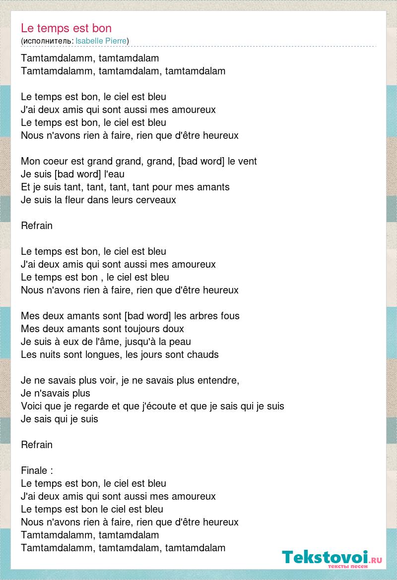 Tamtamdalamm, tamtamdalam Tamtamdalamm, tamtamdalam, tamtamdalam Le temps est bon, le ciel est bleu J'ai deux amis qui sont aussi mes amoureux Le temps est bon, le ciel est bleu Nous n'avons rien à faire, rien que d'être heureux Mon coeur est grand grand, grand, grand comme le vent Je suis douce comme l'eau Et je suis tant, tant, tant, tant pour mes amants Je suis la fleur dans leurs cerveaux Refrain Le temps est bon, le ciel est bleu J'ai deux amis qui sont aussi mes amoureux Le temps est bon , le ciel est bleu Nous n'avons rien à faire, rien que d'être heureux Mes deux amants sont beaux comme les arbres fous Mes deux amants sont toujours doux Je suis à eux de l'âme, jusqu'à la peau Les nuits sont longues, les jours sont chauds Je ne savais plus voir, je ne savais plus entendre, Je n'savais plus Voici que je regarde et que j'écoute et que je sais qui je suis Je sais qui je suis Refrain Finale : Le temps est bon, le ciel est bleu J'ai deux amis qui sont aussi mes amoureux Le temps est bon le ciel est bleu Nous n'avons rien à faire, rien que d'être heureux Tamtamdalamm, tamtamdalam Tamtamdalamm, tamtamdalam, tamtamdalam