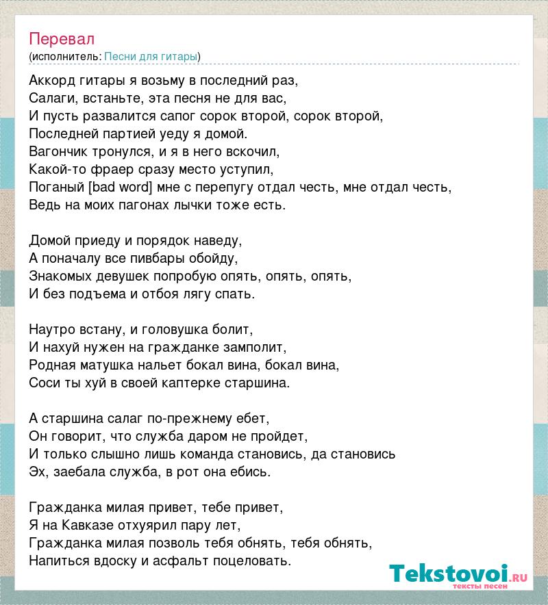 Аккорд гитары я возьму в последний раз, Салаги, встаньте, эта песня не для вас, И пусть развалится сапог сорок второй, сорок второй, Последней партией уеду я домой. Вагончик тронулся, и я в него вскочил, Какой-то фраер сразу место уступил, Поганый [bad word] мне с перепугу отдал честь, мне отдал честь, Ведь на моих пагонах лычки тоже есть. Домой приеду и порядок наведу, А поначалу все пивбары обойду, Знакомых девушек попробую опять, опять, опять, И без подъема и отбоя лягу спать. Наутро встану, и головушка болит, И нахуй нужен на гражданке замполит, Родная матушка нальет бокал вина, бокал вина, Соси ты хуй в своей каптерке старшина. А старшина салаг по-прежнему ебет, Он говорит, что служба даром не пройдет, И только слышно лишь команда становись, да становись Эх, заебала служба, в рот она ебись. Гражданка милая привет, тебе привет, Я на Кавказе отхуярил пару лет, Гражданка милая позволь тебя обнять, тебя обнять, Напиться вдоску и асфальт поцеловать.