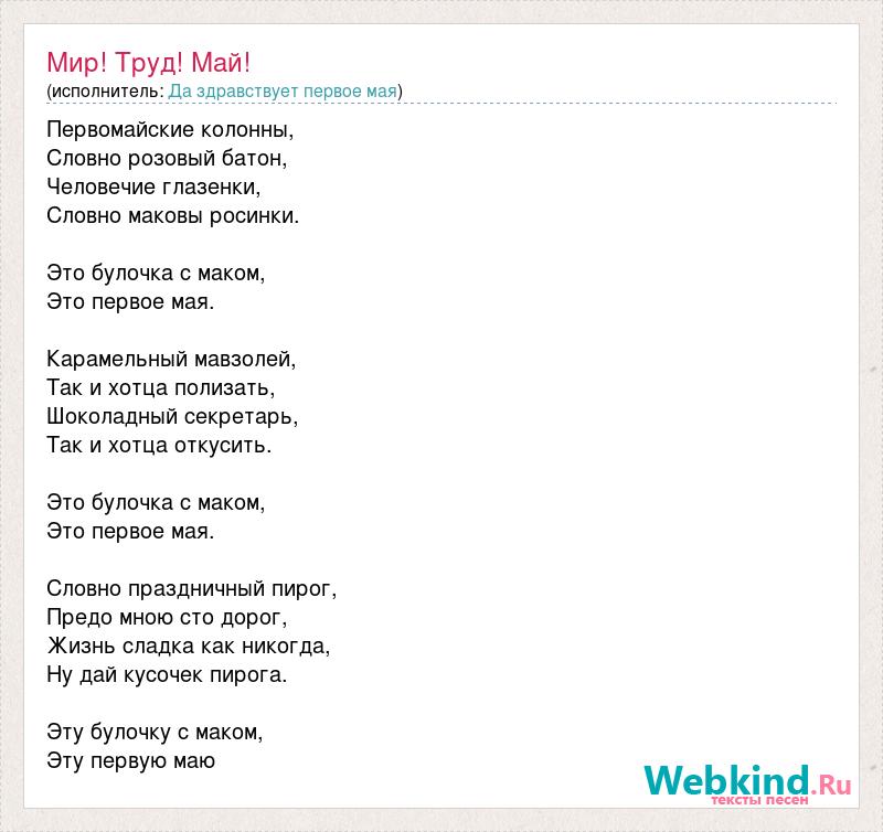 Первомайские колонны, Словно розовый батон, Человечие глазенки, Словно маковы росинки. Это булочка с маком, Это первое мая. Карамельный мавзолей, Так и хотца полизать, Шоколадный секретарь, Так и хотца откусить. Это булочка с маком, Это первое мая. Словно праздничный пирог, Предо мною сто дорог, Жизнь сладка как никогда, Ну дай кусочек пирога. Эту булочку с маком, Эту первую маю