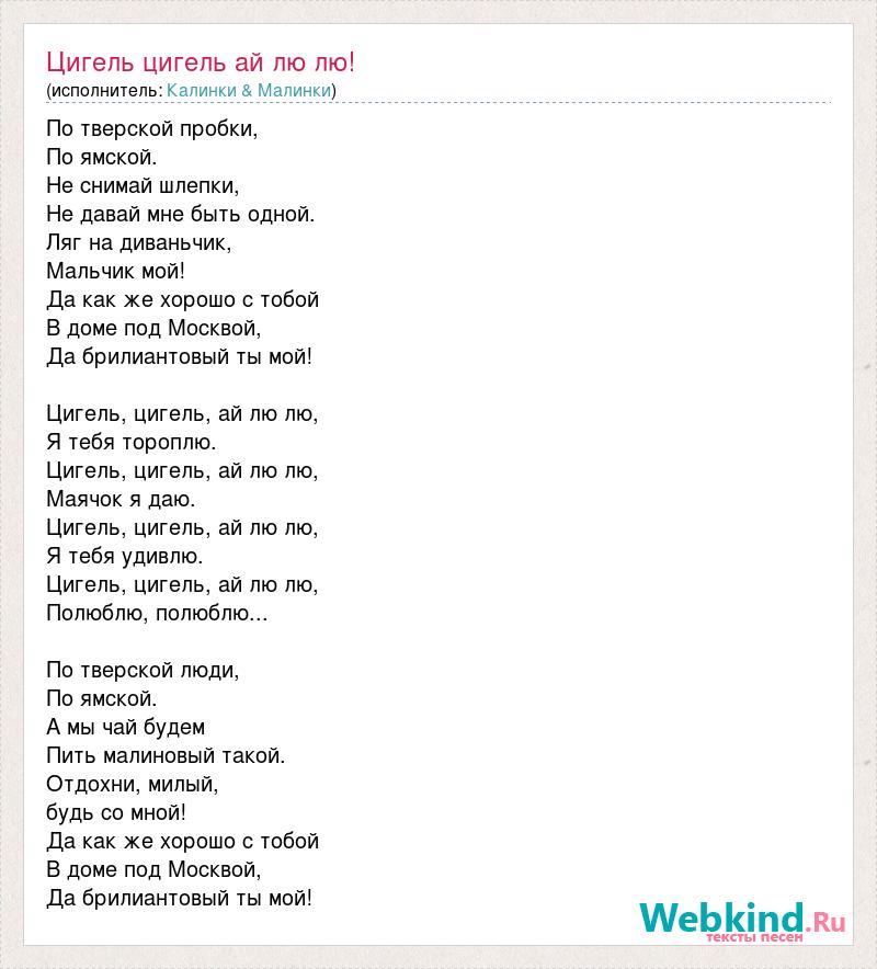 По тверской пробки, По ямской. Не снимай шлепки, Не давай мне быть одной. Ляг на диваньчик, Мальчик мой! Да как же хорошо с тобой В доме под Москвой, Да брилиантовый ты мой! Цигель, цигель, ай лю лю, Я тебя тороплю. Цигель, цигель, ай лю лю, Маячок я даю. Цигель, цигель, ай лю лю, Я тебя удивлю. Цигель, цигель, ай лю лю, Полюблю, полюблю... По тверской люди, По ямской. А мы чай будем Пить малиновый такой. Отдохни, милый, будь со мной! Да как же хорошо с тобой В доме под Москвой, Да брилиантовый ты мой!