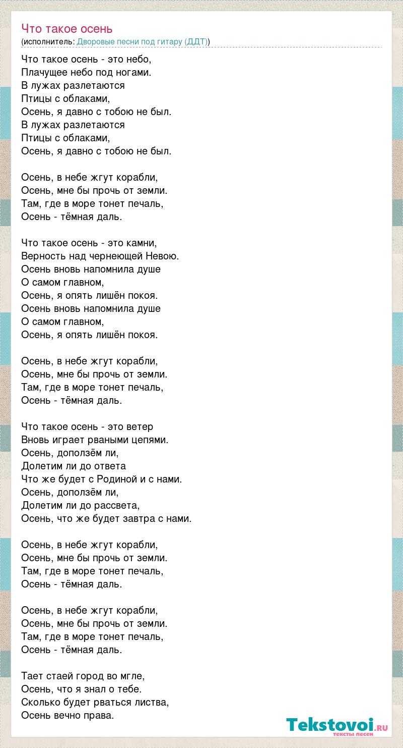 Что такое осень - это небо, Плачущее небо под ногами. В лужах разлетаются Птицы с облаками, Осень, я давно с тобою не был. В лужах разлетаются Птицы с облаками, Осень, я давно с тобою не был. Осень, в небе жгут корабли, Осень, мне бы прочь от земли. Там, где в море тонет печаль, Осень - тёмная даль. Что такое осень - это камни, Верность над чернеющей Невою. Осень вновь напомнила душе О самом главном, Осень, я опять лишён покоя. Осень вновь напомнила душе О самом главном, Осень, я опять лишён покоя. Осень, в небе жгут корабли, Осень, мне бы прочь от земли. Там, где в море тонет печаль, Осень - тёмная даль. Что такое осень - это ветер Вновь играет рваными цепями. Осень, доползём ли, Долетим ли до ответа Что же будет с Родиной и с нами. Осень, доползём ли, Долетим ли до рассвета, Осень, что же будет завтра с нами. Осень, в небе жгут корабли, Осень, мне бы прочь от земли. Там, где в море тонет печаль, Осень - тёмная даль. Осень, в небе жгут корабли, Осень, мне бы прочь от земли. Там, где в море тонет печаль, Осень - тёмная даль. Тает стаей город во мгле, Осень, что я знал о тебе. Сколько будет рваться листва, Осень вечно права.