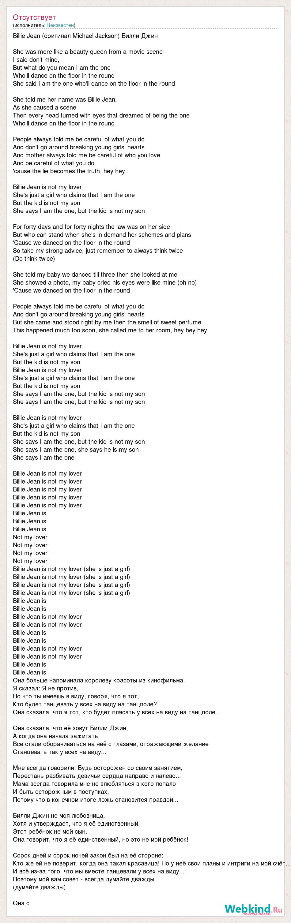 Billie Jean (оригинал Michael Jackson) Билли Джин She was more like a beauty queen from a movie scene I said don't mind, But what do you mean I am the one Who'll dance on the floor in the round She said I am the one who'll dance on the floor in the round She told me her name was Billie Jean, As she caused a scene Then every head turned with eyes that dreamed of being the one Who'll dance on the floor in the round People always told me be careful of what you do And don't go around breaking young girls' hearts And mother always told me be careful of who you love And be careful of what you do 'cause the lie becomes the truth, hey hey Billie Jean is not my lover She's just a girl who claims that I am the one But the kid is not my son She says I am the one, but the kid is not my son For forty days and for forty nights the law was on her side But who can stand when she's in demand her schemes and plans 'Cause we danced on the floor in the round So take my strong advice, just remember to always think twice (Do think twice) She told my baby we danced till three then she looked at me She showed a photo, my baby cried his eyes were like mine (oh no) 'Cause we danced on the floor in the round People always told me be careful of what you do And don't go around breaking young girls' hearts But she came and stood right by me then the smell of sweet perfume This happened much too soon, she called me to her room, hey hey hey Billie Jean is not my lover She's just a girl who claims that I am the one But the kid is not my son Billie Jean is not my lover She's just a girl who claims that I am the one But the kid is not my son She says I am the one, but the kid is not my son She says I am the one, but the kid is not my son Billie Jean is not my lover She's just a girl who claims that I am the one But the kid is not my son She says I am the one, but the kid is not my son She says I am the one, she says he is my son She says I am the one Billie Jean is not my lover Billie Jean is not my lover Billie Jean is not my lover Billie Jean is not my lover Billie Jean is not my lover Billie Jean is Billie Jean is Billie Jean is Not my lover Not my lover Not my lover Not my lover Billie Jean is not my lover (she is just a girl) Billie Jean is not my lover (she is just a girl) Billie Jean is not my lover (she is just a girl) Billie Jean is not my lover (she is just a girl) Billie Jean is Billie Jean is Billie Jean is not my lover Billie Jean is not my lover Billie Jean is Billie Jean is Billie Jean is not my lover Billie Jean is not my lover Billie Jean is Billie Jean is Она больше напоминала королеву красоты из кинофильма. Я сказал: Я не против, Но что ты имеешь в виду, говоря, что я тот, Кто будет танцевать у всех на виду на танцполе? Она сказала, что я тот, кто будет плясать у всех на виду на танцполе... Она сказала, что её зовут Билли Джин, А когда она начала зажигать, Все стали оборачиваться на неё с глазами, отражающими желание Станцевать так у всех на виду... Мне всегда говорили: Будь осторожен со своим занятием, Перестань разбивать девичьи сердца направо и налево... Мама всегда говорила мне не влюбляться в кого попало И быть осторожным в поступках, Потому что в конечном итоге ложь становится правдой... Билли Джин не моя любовница, Хотя и утверждает, что я её единственный. Этот ребёнок не мой сын. Она говорит, что я её единственный, но это не мой ребёнок! Сорок дней и сорок ночей закон был на её стороне: Кто же ей не поверит, когда она такая красавица! Но у неё свои планы и интриги на мой счёт... И всё из-за того, что мы вместе танцевали у всех на виду... Поэтому мой вам совет - всегда думайте дважды (думайте дважды) Она с