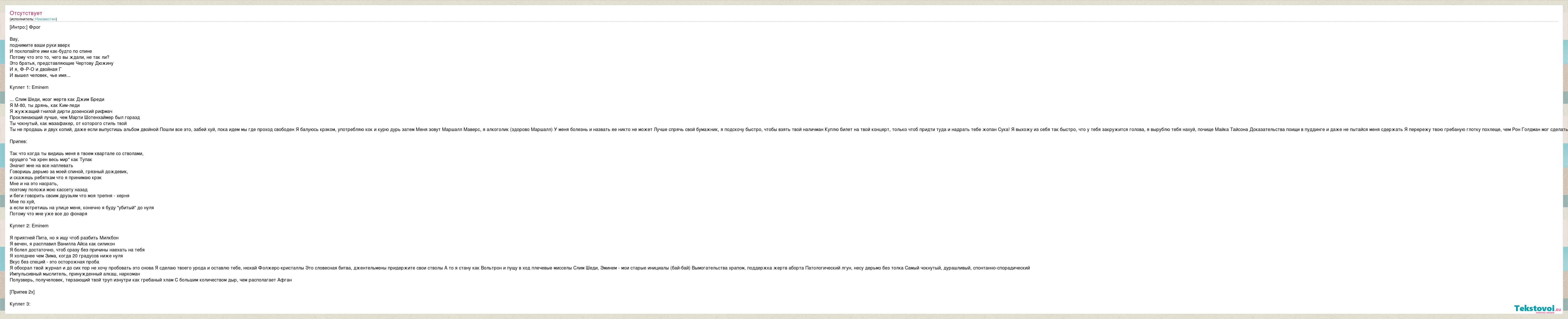 [Интро:] Фрог Вау, поднимите ваши руки вверх И похлопайте ими как-будто по спине Потому что это то, чего вы ждали, не так ли? Это братья, представляющие Чертову Дюжину И я, Ф-Р-О и двойная Г И вышел человек, чье имя... Куплет 1: Eminem ... Слим Шеди, мозг мертв как Джим Бреди Я М-80, ты дрянь, как Ким-леди Я жужжащий гнилой дирти дозенский рифмач Проклинающий лучше, чем Марти Шотенхаймер был горазд Ты чокнутый, как мазафакер, от которого стиль твой Ты не продашь и двух копий, даже если выпустишь альбом двойной Пошли все это, забей хуй, пока идем мы где проход свободен Я балуюсь крэком, употребляю кок и курю дурь затем Меня зовут Маршалл Маверс, я алкоголик (здорово Маршалл) У меня болезнь и назвать ее никто не может Лучше спрячь свой бумажник, я подскочу быстро, чтобы взять твой наличман Куплю билет на твой концерт, только чтоб придти туда и надрать тебе жопан Сука! Я выхожу из себя так быстро, что у тебя закружится голова, я вырублю тебя нахуй, почище Майка Тайсона Доказательства поищи в пуддинге и даже не пытайся меня сдержать Я перережу твою гребаную глотку похлеще, чем Рон Голдман мог сделать Припев: Так что когда ты видишь меня в твоем квартале со стволами, орущего "на хрен весь мир" как Тупак Значит мне на все наплевать Говоришь дерьмо за моей спиной, грязный дождевик, и скажешь ребяткам что я принимаю крэк Мне и на это насрать, поэтому положи мою кассету назад и беги говорить своим друзьям что моя трепня - херня Мне по хуй, а если встретишь на улице меня, конечно я буду "убитый" до нуля Потому что мне уже все до фонаря Куплет 2: Eminem Я приятней Пита, но я ищу чтоб разбить Милкбон Я вечен, я расплавил Ванилла Айса как силикон Я болел достаточно, чтоб сразу без причины наехать на тебя Я холоднее чем Зима, когда 20 градусов ниже нуля Вкус без специй - это осторожная проба Я обосрал твой журнал и до сих пор не хочу пробовать это снова Я сделаю твоего урода и оставлю тебе, нюхай Фолжерс-кристаллы Это словесная битва, джентельмены придержите свои стволы А то я стану как Вольтрон и пущу в ход плечевые мисселы Слим Шеди, Эминем - мои старые инициалы (бай-бай) Вымогательства храпом, поддержка жертв аборта Патологический лгун, несу дерьмо без толка Самый чокнутый, дурашливый, спонтанно-спорадический Импульсивный мыслитель, принужденный алкаш, наркоман Полузверь, получеловек, терзающий твой труп изнутри как гребаный хлам С большим количеством дыр, чем располагает Афган [Припев 2х] Куплет 3:
