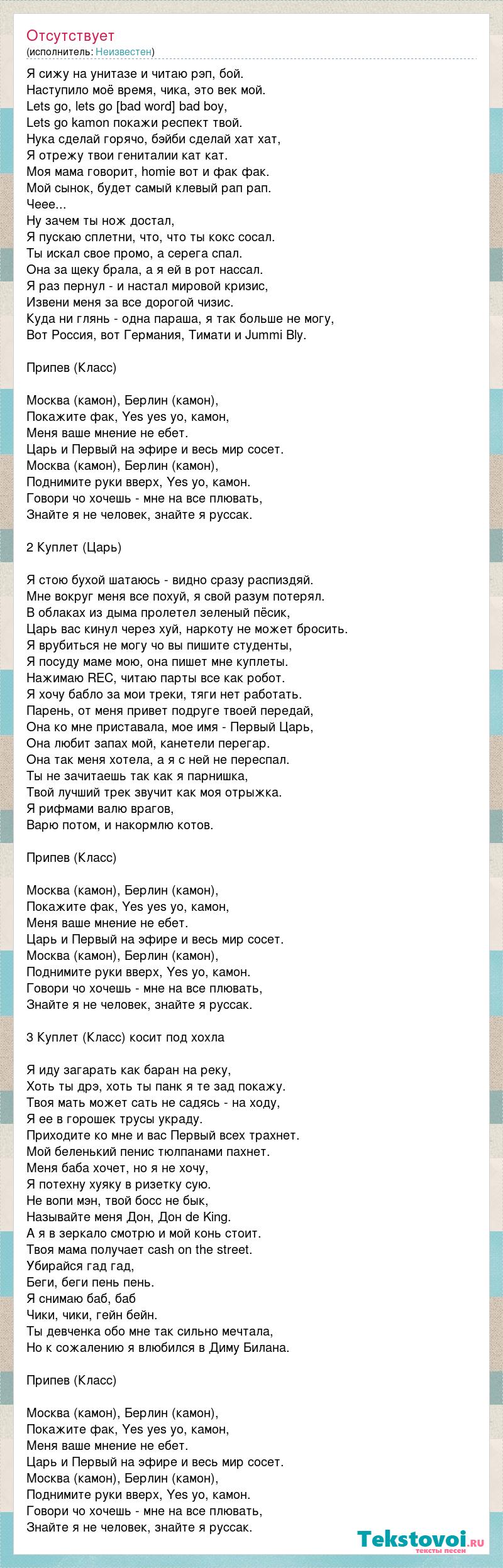 Я сижу на унитазе и читаю рэп, бой. Наступило моё время, чика, это век мой. Lets go, lets go это russian bad boy, Lets go kamon покажи респект твой. Нука сделай горячо, бэйби сделай хат хат, Я отрежу твои гениталии кат кат. Моя мама говорит, homie вот и фак фак. Мой сынок, будет самый клевый рап рап. Чеее... Ну зачем ты нож достал, Я пускаю сплетни, что, что ты кокс сосал. Ты искал свое промо, а серега спал. Она за щеку брала, а я ей в рот нассал. Я раз пернул - и настал мировой кризис, Извени меня за все дорогой чизис. Куда ни глянь - одна параша, я так больше не могу, Вот Россия, вот Германия, Тимати и Jummi Bly. Припев (Класс) Москва (камон), Берлин (камон), Покажите фак, Yes yes yo, камон, Меня ваше мнение не ебет. Царь и Первый на эфире и весь мир сосет. Москва (камон), Берлин (камон), Поднимите руки вверх, Yes yo, камон. Говори чо хочешь - мне на все плювать, Знайте я не человек, знайте я руссак. 2 Куплет (Царь) Я стою бухой шатаюсь - видно сразу распиздяй. Мне вокруг меня все похуй, я свой разум потерял. В облаках из дыма пролетел зеленый пёсик, Царь вас кинул через хуй, наркоту не может бросить. Я врубиться не могу чо вы пишите студенты, Я посуду маме мою, она пишет мне куплеты. Нажимаю REC, читаю парты все как робот. Я хочу бабло за мои треки, тяги нет работать. Парень, от меня привет подруге твоей передай, Она ко мне приставала, мое имя - Первый Царь, Она любит запах мой, канетели перегар. Она так меня хотела, а я с ней не переспал. Ты не зачитаешь так как я парнишка, Твой лучший трек звучит как моя отрыжка. Я рифмами валю врагов, Варю потом, и накормлю котов. Припев (Класс) Москва (камон), Берлин (камон), Покажите фак, Yes yes yo, камон, Меня ваше мнение не ебет. Царь и Первый на эфире и весь мир сосет. Москва (камон), Берлин (камон), Поднимите руки вверх, Yes yo, камон. Говори чо хочешь - мне на все плювать, Знайте я не человек, знайте я руссак. 3 Куплет (Класс) косит под хохла Я иду загарать как баран на реку, Хоть ты дрэ, хоть ты панк я те зад покажу. Твоя мать может сать не садясь - на ходу, Я ее в горошек трусы украду. Приходите ко мне и вас Первый всех трахнет. Мой беленький пенис тюлпанами пахнет. Меня баба хочет, но я не хочу, Я потехну хуяку в ризетку сую. Не вопи мэн, твой босс не бык, Называйте меня Дон, Дон de King. А я в зеркало смотрю и мой конь стоит. Твоя мама получает cash on the street. Убирайся гад гад, Беги, беги пень пень. Я снимаю баб, баб Чики, чики, гейн бейн. Ты девченка обо мне так сильно мечтала, Но к сожалению я влюбился в Диму Билана. Припев (Класс) Москва (камон), Берлин (камон), Покажите фак, Yes yes yo, камон, Меня ваше мнение не ебет. Царь и Первый на эфире и весь мир сосет. Москва (камон), Берлин (камон), Поднимите руки вверх, Yes yo, камон. Говори чо хочешь - мне на все плювать, Знайте я не человек, знайте я руссак.