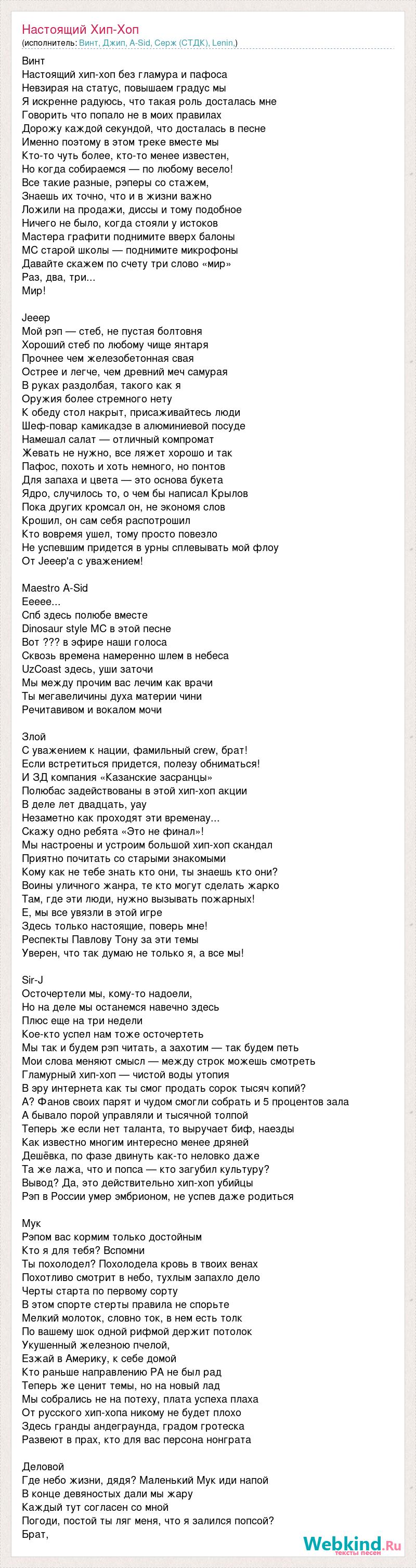 Винт Настоящий хип-хоп без гламура и пафоса Невзирая на статус, повышаем градус мы Я искренне радуюсь, что такая роль досталась мне Говорить что попало не в моих правилах Дорожу каждой секундой, что досталась в песне Именно поэтому в этом треке вместе мы Кто-то чуть более, кто-то менее известен, Но когда собираемся — по любому весело! Все такие разные, рэперы со стажем, Знаешь их точно, что и в жизни важно Ложили на продажи, диссы и тому подобное Ничего не было, когда стояли у истоков Мастера графити поднимите вверх балоны МС старой школы — поднимите микрофоны Давайте скажем по счету три слово «мир» Раз, два, три... Мир! Jeeep Мой рэп — стеб, не пустая болтовня Хороший стеб по любому чище янтаря Прочнее чем железобетонная свая Острее и легче, чем древний меч самурая В руках раздолбая, такого как я Оружия более стремного нету К обеду стол накрыт, присаживайтесь люди Шеф-повар камикадзе в алюминиевой посуде Намешал салат — отличный компромат Жевать не нужно, все ляжет хорошо и так Пафос, похоть и хоть немного, но понтов Для запаха и цвета — это основа букета Ядро, случилось то, о чем бы написал Крылов Пока других кромсал он, не экономя слов Крошил, он сам себя распотрошил Кто вовремя ушел, тому просто повезло Не успевшим придется в урны сплевывать мой флоу От Jeeep'a с уважением! Maestro A-Sid Еееее... Спб здесь полюбе вместе Dinosaur style МС в этой песне Вот ??? в эфире наши голоса Сквозь времена намеренно шлем в небеса UzCoast здесь, уши заточи Мы между прочим вас лечим как врачи Ты мегавеличины духа материи чини Речитавивом и вокалом мочи Злой С уважением к нации, фамильный crew, брат! Если встретиться придется, полезу обниматься! И ЗД компания «Казанские засранцы» Полюбас задействованы в этой хип-хоп акции В деле лет двадцать, уау Незаметно как проходят эти временау... Скажу одно ребята «Это не финал»! Мы настроены и устроим большой хип-хоп скандал Приятно почитать со старыми знакомыми Кому как не тебе знать кто они, ты знаешь кто они? Воины уличного жанра, те кто могут сделать жарко Там, где эти люди, нужно вызывать пожарных! Е, мы все увязли в этой игре Здесь только настоящие, поверь мне! Респекты Павлову Тону за эти темы Уверен, что так думаю не только я, а все мы! Sir-J Осточертели мы, кому-то надоели, Но на деле мы останемся навечно здесь Плюс еще на три недели Кое-кто успел нам тоже осточертеть Мы так и будем рэп читать, а захотим — так будем петь Мои слова меняют смысл — между строк можешь смотреть Гламурный хип-хоп — чистой воды утопия В эру интернета как ты смог продать сорок тысяч копий? А? Фанов своих парят и чудом смогли собрать и 5 процентов зала А бывало порой управляли и тысячной толпой Теперь же если нет таланта, то выручает биф, наезды Как известно многим интересно менее дряней Дешёвка, по фазе двинуть как-то неловко даже Та же лажа, что и попса — кто загубил культуру? Вывод? Да, это действительно хип-хоп убийцы Рэп в России умер эмбрионом, не успев даже родиться Мук Рэпом вас кормим только достойным Кто я для тебя? Вспомни Ты похолодел? Похолодела кровь в твоих венах Похотливо смотрит в небо, тухлым запахло дело Черты старта по первому сорту В этом спорте стерты правила не спорьте Мелкий молоток, словно ток, в нем есть толк По вашему шок одной рифмой держит потолок Укушенный железною пчелой, Езжай в Америку, к себе домой Кто раньше направлению РА не был рад Теперь же 