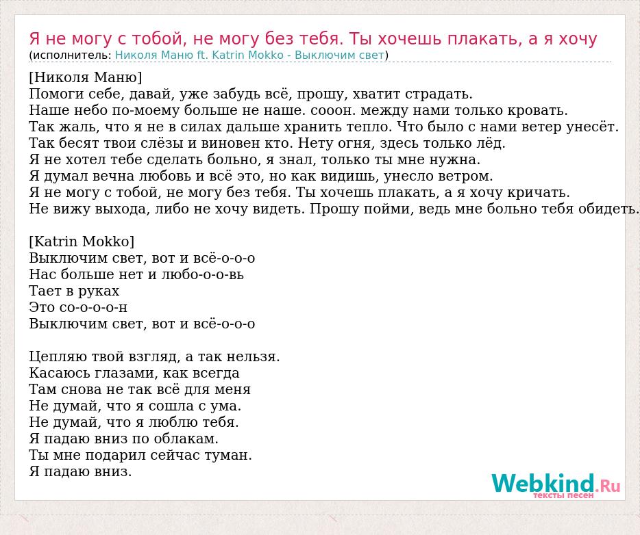 Главная→Исполнители→Николя Маню ft. Katrin Mokko - Выключим свет→Я не могу с тобой, не могу без тебя. Ты хочешь плакать, а я хочу