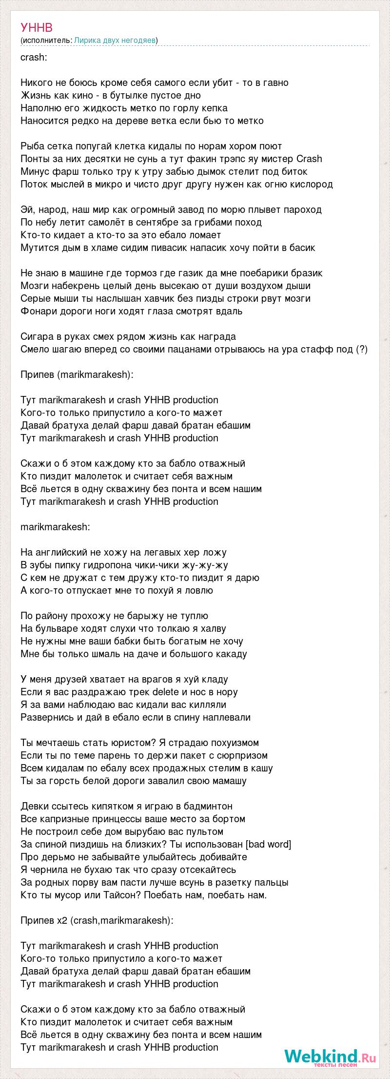 crash: Никого не боюсь кроме себя самого если убит - то в гавно Жизнь как кино - в бутылке пустое дно Наполню его жидкость метко по горлу кепка Наносится редко на дереве ветка если бью то метко Рыба сетка попугай клетка кидалы по норам хором поют Понты за них десятки не сунь а тут факин трэпс яу мистер Crash Минус фарш только тру к утру забью дымок стелит под биток Поток мыслей в микро и чисто друг другу нужен как огню кислород Эй, народ, наш мир как огромный завод по морю плывет пароход По небу летит самолёт в сентябре за грибами поход Кто-то кидает а кто-то за это ебало ломает Мутится дым в хламе сидим пивасик напасик хочу пойти в басик Не знаю в машине где тормоз где газик да мне поебарики бразик Мозги набекрень целый день высекаю от души воздухом дыши Серые мыши ты наслышан хавчик без пизды строки рвут мозги Фонари дороги ноги ходят глаза смотрят вдаль Сигара в руках смех рядом жизнь как награда Смело шагаю вперед со своими пацанами отрываюсь на ура стафф под (?) Припев (marikmarakesh): Тут marikmarakesh и crash УННВ production Кого-то только припустило а кого-то мажет Давай братуха делай фарш давай братан ебашим Тут marikmarakesh и crash УННВ production Скажи о б этом каждому кто за бабло отважный Кто пиздит малолеток и считает себя важным Всё льется в одну скважину без понта и всем нашим Тут marikmarakesh и crash УННВ production marikmarakesh: На английский не хожу на легавых хер ложу В зубы пипку гидропона чики-чики жу-жу-жу С кем не дружат с тем дружу кто-то пиздит я дарю А кого-то отпускает мне то похуй я ловлю По району прохожу не барыжу не туплю На бульваре ходят слухи что толкаю я халву Не нужны мне ваши бабки быть богатым не хочу Мне бы только шмаль на даче и большого какаду У меня друзей хватает на врагов я хуй кладу Если я вас раздражаю трек delete и нос в нору Я за вами наблюдаю вас кидали вас килляли Развернись и дай в ебало если в спину наплевали Ты мечтаешь стать юристом? Я страдаю похуизмом Если ты по теме парень то держи пакет с сюрпризом Всем кидалам по ебалу всех продажных стелим в кашу Ты за горсть белой дороги завалил свою мамашу Девки ссытесь кипятком я играю в бадминтон Все капризные принцессы ваше место за бортом Не построил себе дом вырубаю вас пультом За спиной пиздишь на близких? Ты использован [bad word] Про дерьмо не забывайте улыбайтесь добивайте Я чернила не бухаю так что сразу отсекайтесь За родных порву вам паcти лучше всунь в разетку пальцы Кто ты мусор или Тайсон? Поебать нам, поебать нам. Припев x2 (crash,marikmarakesh): Тут marikmarakesh и crash УННВ production Кого-то только припустило а кого-то мажет Давай братуха делай фарш давай братан ебашим Тут marikmarakesh и crash УННВ production Скажи о б этом каждому кто за бабло отважный Кто пиздит малолеток и считает себя важным Всё льется в одну скважину без понта и всем нашим Тут marikmarakesh и crash УННВ production