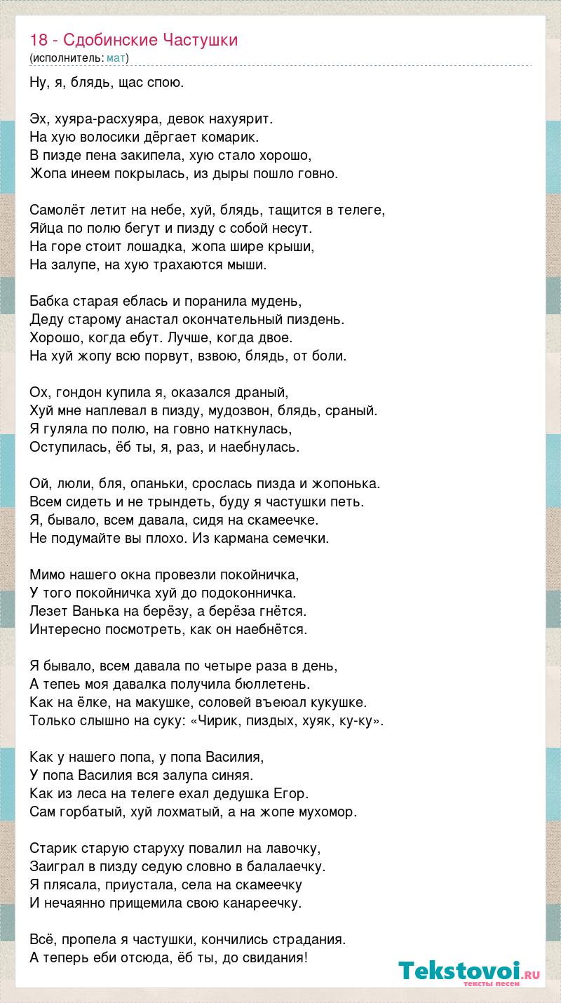 Ну, я, блядь, щас спою. Эх, хуяра-расхуяра, девок нахуярит. На хую волосики дёргает комарик. В пизде пена закипела, хую стало хорошо, Жопа инеем покрылась, из дыры пошло говно. Самолёт летит на небе, хуй, блядь, тащится в телеге, Яйца по полю бегут и пизду с собой несут. На горе стоит лошадка, жопа шире крыши, На залупе, на хую трахаются мыши. Бабка старая еблась и поранила мудень, Деду старому анастал окончательный пиздень. Хорошо, когда ебут. Лучше, когда двое. На хуй жопу всю порвут, взвою, блядь, от боли. Ох, гондон купила я, оказался драный, Хуй мне наплевал в пизду, мудозвон, блядь, сраный. Я гуляла по полю, на говно наткнулась, Оступилась, ёб ты, я, раз, и наебнулась. Ой, люли, бля, опаньки, срослась пизда и жопонька. Всем сидеть и не трындеть, буду я частушки петь. Я, бывало, всем давала, сидя на скамеечке. Не подумайте вы плохо. Из кармана семечки. Мимо нашего окна провезли покойничка, У того покойничка хуй до подоконничка. Лезет Ванька на берёзу, а берёза гнётся. Интересно посмотреть, как он наебнётся. Я бывало, всем давала по четыре раза в день, А тепеь моя давалка получила бюллетень. Как на ёлке, на макушке, соловей въеюал кукушке. Только слышно на суку: «Чирик, пиздых, хуяк, ку-ку». Как у нашего попа, у попа Василия, У попа Василия вся залупа синяя. Как из леса на телеге ехал дедушка Егор. Сам горбатый, хуй лохматый, а на жопе мухомор. Старик старую старуху повалил на лавочку, Заиграл в пизду седую словно в балалаечку. Я плясала, приустала, села на скамеечку И нечаянно прищемила свою канареечку. Всё, пропела я частушки, кончились страдания. А теперь еби отсюда, ёб ты, до свидания!