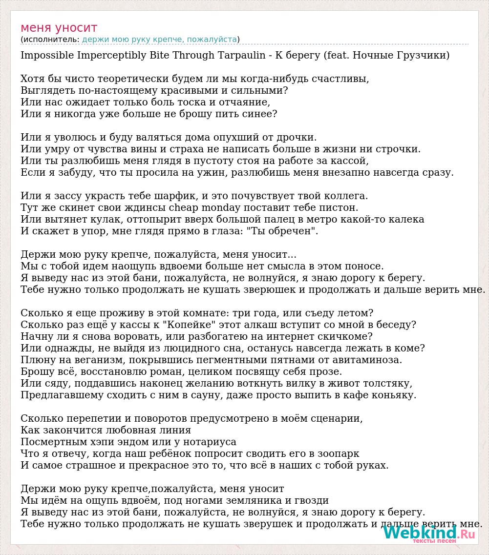 Impossible Imperceptibly Bite Through Tarpaulin - К берегу (feat. Ночные Грузчики) Хотя бы чисто теоретически будем ли мы когда-нибудь счастливы, Выглядеть по-настоящему красивыми и сильными? Или нас ожидает только боль тоска и отчаяние, Или я никогда уже больше не брошу пить синее? Или я уволюсь и буду валяться дома опухший от дрочки. Или умру от чувства вины и страха не написать больше в жизни ни строчки. Или ты разлюбишь меня глядя в пустоту стоя на работе за кассой, Если я забуду, что ты просила на ужин, разлюбишь меня внезапно навсегда сразу. Или я зассу украсть тебе шарфик, и это почувствует твой коллега. Тут же скинет свои ждинсы cheap monday поставит тебе пистон. Или вытянет кулак, оттопырит вверх большой палец в метро какой-то калека И скажет в упор, мне глядя прямо в глаза: "Ты обречен". Держи мою руку крепче, пожалуйста, меня уносит... Мы с тобой идем наощупь вдвоеми больше нет смысла в этом поносе. Я выведу нас из этой бани, пожалуйста, не волнуйся, я знаю дорогу к берегу. Тебе нужно только продолжать не кушать зверюшек и продолжать и дальше верить мне. Сколько я еще проживу в этой комнате: три года, или съеду летом? Сколько раз ещё у кассы к "Копейке" этот алкаш вступит со мной в беседу? Начну ли я снова воровать, или разбогатею на интернет скичкоме? Или однажды, не выйдя из люцидного сна, останусь навсегда лежать в коме? Плюну на веганизм, покрывшись пегментными пятнами от авитаминоза. Брошу всё, восстановлю роман, целиком посвящу себя прозе. Или сяду, поддавшись наконец желанию воткнуть вилку в живот толстяку, Предлагавшему сходить с ним в сауну, даже просто выпить в кафе коньяку. Сколько перепетии и поворотов предусмотрено в моём сценарии, Как закончится любовная линия Посмертным хэпи эндом или у нотариуса Что я отвечу, когда наш ребёнок попросит сводить его в зоопарк И самое страшное и прекрасное это то, что всё в наших с тобой руках. Держи мою руку крепче,пожалуйста, меня уносит Мы идём на ощупь вдвоём, под ногами земляника и гвозди Я выведу нас из этой бани, пожалуйста, не волнуйся, я знаю дорогу к берегу. Тебе нужно только продолжать не кушать зверушек и продолжать и дальше верить мне.