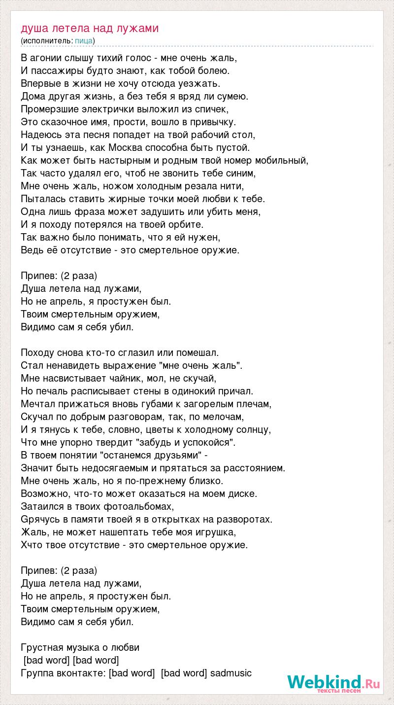 В агонии слышу тихий голос - мне очень жаль, И пассажиры будто знают, как тобой болею. Впервые в жизни не хочу отсюда уезжать. Дома другая жизнь, а без тебя я вряд ли сумею. Промерзшие электрички выложил из спичек, Это сказочное имя, прости, вошло в привычку. Надеюсь эта песня попадет на твой рабочий стол, И ты узнаешь, как Москва способна быть пустой. Как может быть настырным и родным твой номер мобильный, Так часто удалял его, чтоб не звонить тебе синим, Мне очень жаль, ножом холодным резала нити, Пыталась ставить жирные точки моей любви к тебе. Одна лишь фраза может задушить или убить меня, И я походу потерялся на твоей орбите. Так важно было понимать, что я ей нужен, Ведь её отсутствие - это смертельное оружие. Припев: (2 раза) Душа летела над лужами, Но не апрель, я простужен был. Твоим смертельным оружием, Видимо сам я себя убил. Походу снова кто-то сглазил или помешал. Стал ненавидеть выражение "мне очень жаль". Мне насвистывает чайник, мол, не скучай, Но печаль расписывает стены в одинокий причал. Мечтал прижаться вновь губами к загорелым плечам, Скучал по добрым разговорам, так, по мелочам, И я тянусь к тебе, словно, цветы к холодному солнцу, Что мне упорно твердит "забудь и успокойся". В твоем понятии "останемся друзьями" - Значит быть недосягаемым и прятаться за расстоянием. Мне очень жаль, но я по-прежнему близко. Возможно, что-то может оказаться на моем диске. Затаился в твоих фотоальбомах, Gрячусь в памяти твоей я в открытках на разворотах. Жаль, не может нашептать тебе моя игрушка, Xчто твое отсутствие - это смертельное оружие. Припев: (2 раза) Душа летела над лужами, Но не апрель, я простужен был. Твоим смертельным оружием, Видимо сам я себя убил. Грустная музыка о любви [bad word] [bad word] Группа вконтакте: [bad word] [bad word] sadmusic