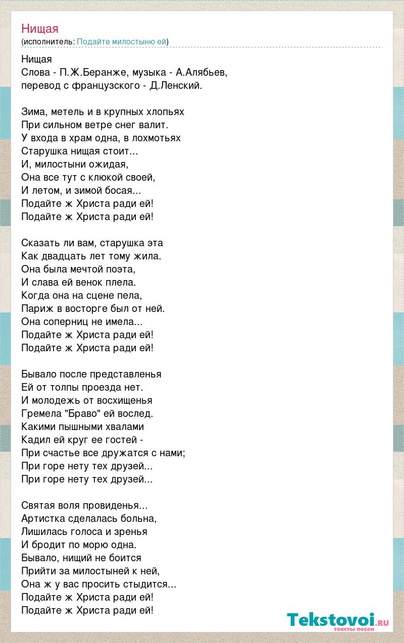 Нищая Слова - П.Ж.Беранже, музыка - А.Алябьев, перевод с французского - Д.Ленский. Зима, метель и в крупных хлопьях При сильном ветре снег валит. У входа в храм одна, в лохмотьях Старушка нищая стоит... И, милостыни ожидая, Она все тут с клюкой своей, И летом, и зимой босая... Подайте ж Христа ради ей! Подайте ж Христа ради ей! Сказать ли вам, старушка эта Как двадцать лет тому жила. Она была мечтой поэта, И слава ей венок плела. Когда она на сцене пела, Париж в восторге был от ней. Она соперниц не имела... Подайте ж Христа ради ей! Подайте ж Христа ради ей! Бывало после представленья Ей от толпы проезда нет. И молодежь от восхищенья Гремела "Браво" ей вослед. Какими пышными хвалами Кадил ей круг ее гостей - При счастье все дружатся с нами; При горе нету тех друзей... При горе нету тех друзей... Святая воля провиденья... Артистка сделалась больна, Лишилась голоса и зренья И бродит по морю одна. Бывало, нищий не боится Прийти за милостыней к ней, Она ж у вас просить стыдится... Подайте ж Христа ради ей! Подайте ж Христа ради ей!