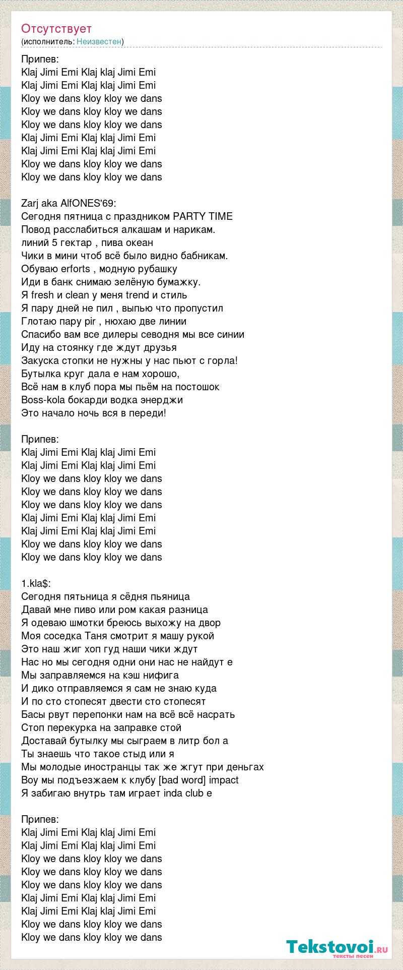 Припев: Klaj Jimi Emi Klaj klaj Jimi Emi Klaj Jimi Emi Klaj klaj Jimi Emi Kloy we dans kloy kloy we dans Kloy we dans kloy kloy we dans Kloy we dans kloy kloy we dans Klaj Jimi Emi Klaj klaj Jimi Emi Klaj Jimi Emi Klaj klaj Jimi Emi Kloy we dans kloy kloy we dans Kloy we dans kloy kloy we dans Zarj aka AlfONES'69: Сегодня пятница с праздником PARTY TIME Повод расслабиться алкашам и нарикам. линий 5 гектар , пива океан Чики в мини чтоб всё было видно бабникам. Обуваю erforts , модную рубашку Иди в банк снимаю зелёную бумажку. Я fresh и clean у меня trend и стиль Я пару дней не пил , выпью что пропустил Глотаю пару pir , нюхаю две линии Спасибо вам все дилеры севодня мы все синии Иду на стоянку где ждут друзья Закуска стопки не нужны у нас пьют с горла! Бутылка круг дала е нам хорошо, Всё нам в клуб пора мы пьём на постошок Вoss-kola бокарди водка энерджи Это начало ночь вся в переди! Припев: Klaj Jimi Emi Klaj klaj Jimi Emi Klaj Jimi Emi Klaj klaj Jimi Emi Kloy we dans kloy kloy we dans Kloy we dans kloy kloy we dans Kloy we dans kloy kloy we dans Klaj Jimi Emi Klaj klaj Jimi Emi Klaj Jimi Emi Klaj klaj Jimi Emi Kloy we dans kloy kloy we dans Kloy we dans kloy kloy we dans 1.kla$: Сегодня пятьница я сёдня пьяница Давай мне пиво или ром какая разница Я одеваю шмотки бреюсь выхожу на двор Моя соседка Таня смотрит я машу рукой Это наш жиг хоп гуд наши чики ждут Нас но мы сегодня одни они нас не найдут е Мы заправляемся на кэш нифига И дико отправляемся я сам не знаю куда И по сто стопесят двести сто стопесят Басы рвут перепонки нам на всё всё насрать Стоп перекурка на заправке стой Доставай бутылку мы сыграем в литр бол а Ты знаешь что такое стыд или я Мы молодые иностранцы так же жгут при деньгах Boy мы подъезжаем к клубу [bad word] impact Я забигаю внутрь там играет inda club е Припев: Klaj Jimi Emi Klaj klaj Jimi Emi Klaj Jimi Emi Klaj klaj Jimi Emi Kloy we dans kloy kloy we dans Kloy we dans kloy kloy we dans Kloy we dans kloy kloy we dans Klaj Jimi Emi Klaj klaj Jimi Emi Klaj Jimi Emi Klaj klaj Jimi Emi Kloy we dans kloy kloy we dans Kloy we dans kloy kloy we dans
