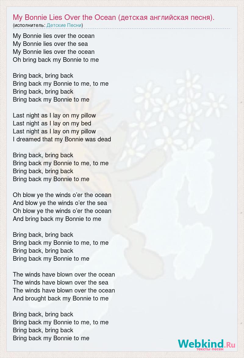 My Bonnie lies over the ocean My Bonnie lies over the sea My Bonnie lies over the ocean Oh bring back my Bonnie to me Bring back, bring back Bring back my Bonnie to me, to me Bring back, bring back Bring back my Bonnie to me Last night as I lay on my pillow Last night as I lay on my bed Last night as I lay on my pillow I dreamed that my Bonnie was dead Bring back, bring back Bring back my Bonnie to me, to me Bring back, bring back Bring back my Bonnie to me Oh blow ye the winds o’er the ocean And blow ye the winds o’er the sea Oh blow ye the winds o’er the ocean And bring back my Bonnie to me Bring back, bring back Bring back my Bonnie to me, to me Bring back, bring back Bring back my Bonnie to me The winds have blown over the ocean The winds have blown over the sea The winds have blown over the ocean And brought back my Bonnie to me Bring back, bring back Bring back my Bonnie to me, to me Bring back, bring back Bring back my Bonnie to me