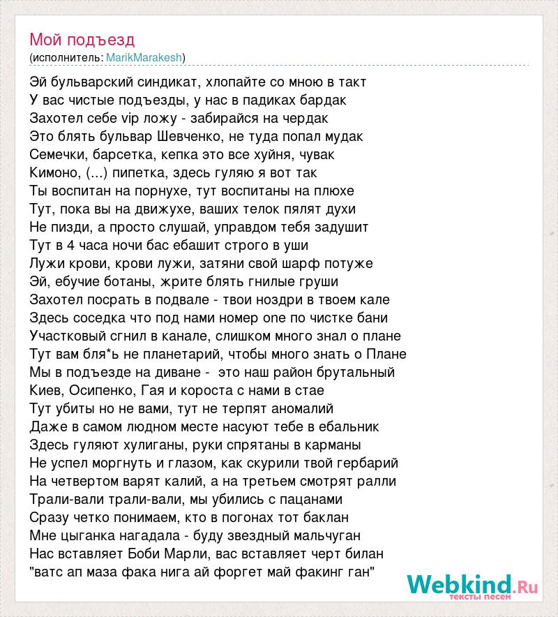Эй бульварский синдикат, хлопайте со мною в такт У вас чистые подъезды, у нас в падиках бардак Захотел себе vip ложу - забирайся на чердак Это блять бульвар Шевченко, не туда попал мудак Семечки, барсетка, кепка это все хуйня, чувак Кимоно, (...) пипетка, здесь гуляю я вот так Ты воспитан на порнухе, тут воспитаны на плюхе Тут, пока вы на движухе, ваших телок пялят духи Не пизди, а просто слушай, управдом тебя задушит Тут в 4 часа ночи бас ебашит строго в уши Лужи крови, крови лужи, затяни свой шарф потуже Эй, ебучие ботаны, жрите блять гнилые груши Захотел посрать в подвале - твои ноздри в твоем кале Здесь соседка что под нами номер one по чистке бани Участковый сгнил в канале, слишком много знал о плане Тут вам бля*ь не планетарий, чтобы много знать о Плане Мы в подъезде на диване - это наш район брутальный Киев, Осипенко, Гая и короста с нами в стае Тут убиты но не вами, тут не терпят аномалий Даже в самом людном месте насуют тебе в ебальник Здесь гуляют хулиганы, руки спрятаны в карманы Не успел моргнуть и глазом, как скурили твой гербарий На четвертом варят калий, а на третьем смотрят ралли Трали-вали трали-вали, мы убились с пацанами Сразу четко понимаем, кто в погонах тот баклан Мне цыганка нагадала - буду звездный мальчуган Нас вставляет Боби Марли, вас вставляет черт билан "ватс ап маза фака нига ай форгет май факинг ган"