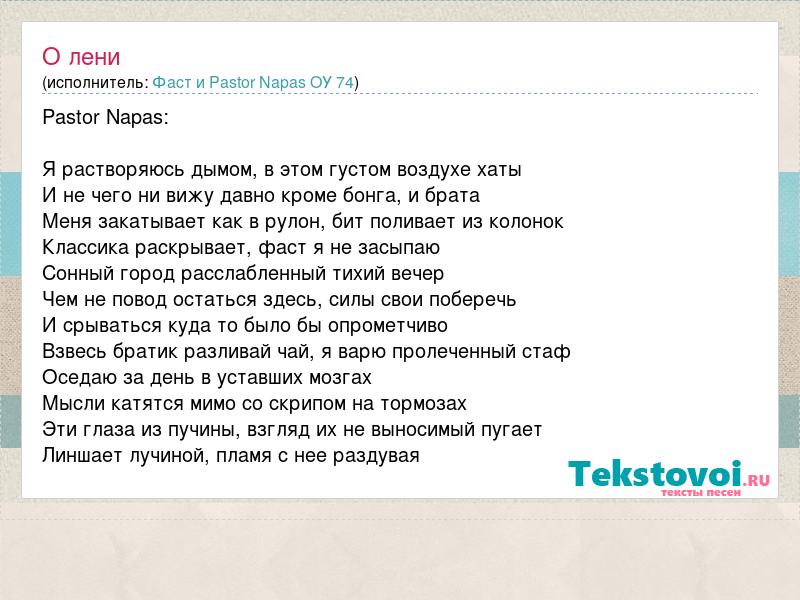 Pastor Napas: Я растворяюсь дымом, в этом густом воздухе хаты И не чего ни вижу давно кроме бонга, и брата Меня закатывает как в рулон, бит поливает из колонок Классика раскрывает, фаст я не засыпаю Сонный город расслабленный тихий вечер Чем не повод остаться здесь, силы свои поберечь И срываться куда то было бы опрометчиво Взвесь братик разливай чай, я варю пролеченный стаф Оседаю за день в уставших мозгах Мысли катятся мимо со скрипом на тормозах Эти глаза из пучины, взгляд их не выносимый пугает Линшает лучиной, пламя с нее раздувая
