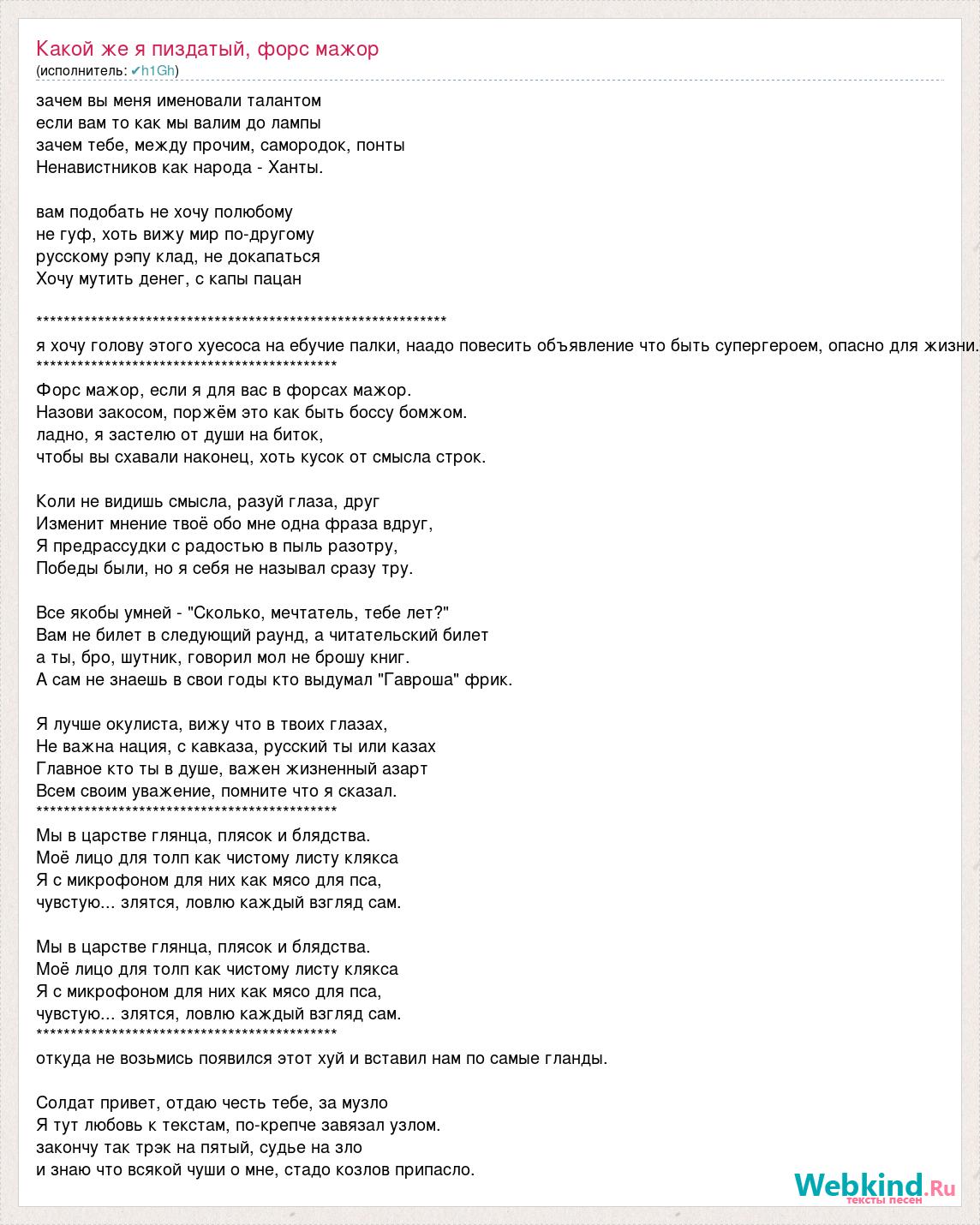 зачем вы меня именовали талантом если вам то как мы валим до лампы зачем тебе, между прочим, самородок, понты Ненавистников как народа - Ханты. вам подобать не хочу полюбому не гуф, хоть вижу мир по-другому русскому рэпу клад, не докапаться Хочу мутить денег, с капы пацан ************************************************************ я хочу голову этого хуесоса на ебучие палки, наадо повесить объявление что быть супергероем, опасно для жизни. ******************************************** Форс мажор, если я для вас в форсах мажор. Назови закосом, поржём это как быть боссу бомжом. ладно, я застелю от души на биток, чтобы вы схавали наконец, хоть кусок от смысла строк. Коли не видишь смысла, разуй глаза, друг Изменит мнение твоё обо мне одна фраза вдруг, Я предрассудки с радостью в пыль разотру, Победы были, но я себя не называл сразу тру. Все якобы умней - "Сколько, мечтатель, тебе лет?" Вам не билет в следующий раунд, а читательский билет а ты, бро, шутник, говорил мол не брошу книг. А сам не знаешь в свои годы кто выдумал "Гавроша" фрик. Я лучше окулиста, вижу что в твоих глазах, Не важна нация, с кавказа, русский ты или казах Главное кто ты в душе, важен жизненный азарт Всем своим уважение, помните что я сказал. ******************************************** Мы в царстве глянца, плясок и блядства. Моё лицо для толп как чистому листу клякса Я с микрофоном для них как мясо для пса, чувстую... злятся, ловлю каждый взгляд сам. Мы в царстве глянца, плясок и блядства. Моё лицо для толп как чистому листу клякса Я с микрофоном для них как мясо для пса, чувстую... злятся, ловлю каждый взгляд сам. ******************************************** откуда не возьмись появился этот хуй и вставил нам по самые гланды. Солдат привет, отдаю честь тебе, за музло Я тут любовь к текстам, по-крепче завязал узлом. закончу так трэк на пятый, судье на зло и знаю что всякой чуши о мне, стадо козлов припасло.