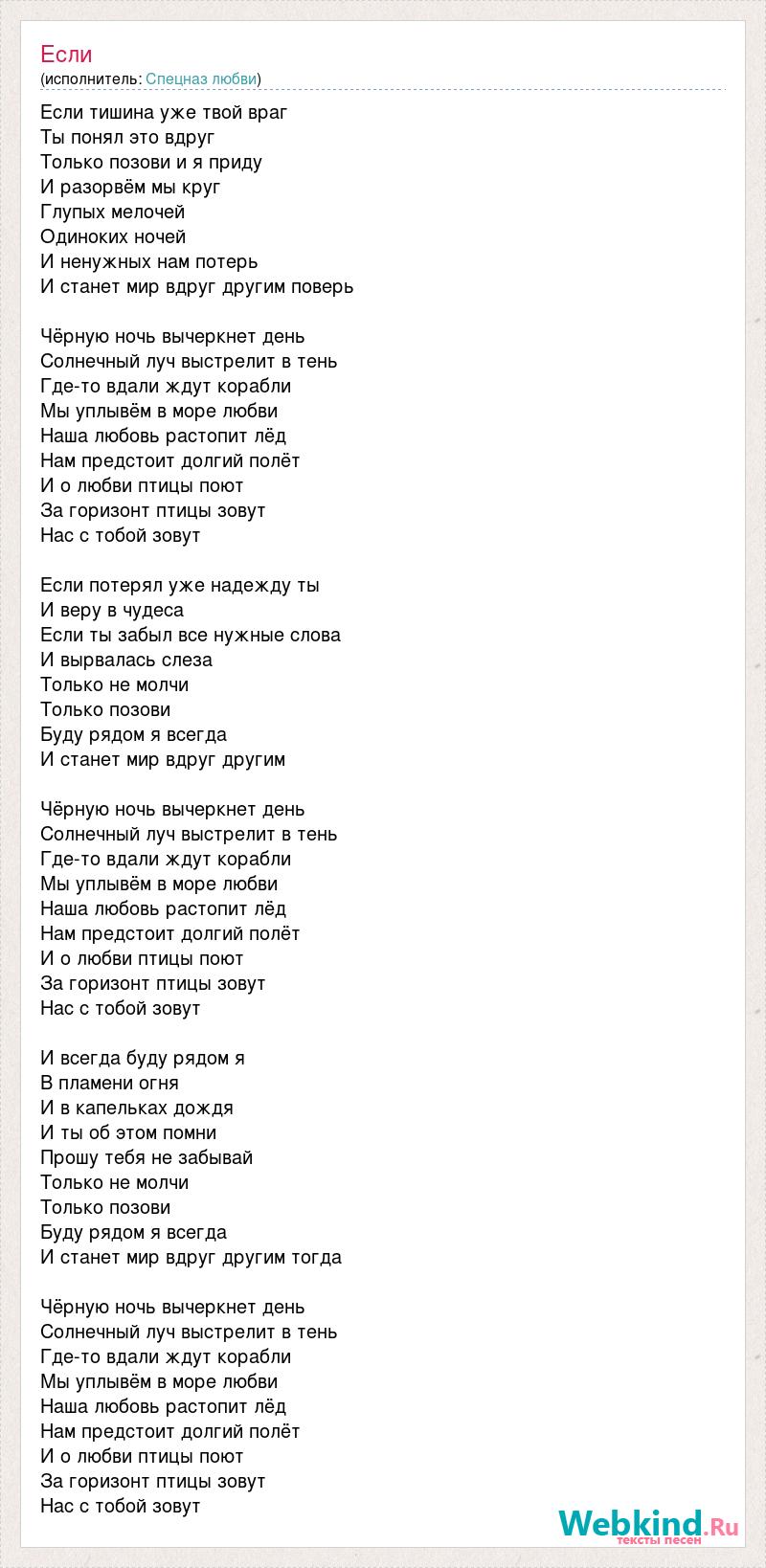 Если тишина уже твой враг Ты понял это вдруг Только позови и я приду И разорвём мы круг Глупых мелочей Одиноких ночей И ненужных нам потерь И станет мир вдруг другим поверь Чёрную ночь вычеркнет день Солнечный луч выстрелит в тень Где-то вдали ждут корабли Мы уплывём в море любви Наша любовь растопит лёд Нам предстоит долгий полёт И о любви птицы поют За горизонт птицы зовут Нас с тобой зовут Если потерял уже надежду ты И веру в чудеса Если ты забыл все нужные слова И вырвалась слеза Только не молчи Только позови Буду рядом я всегда И станет мир вдруг другим Чёрную ночь вычеркнет день Солнечный луч выстрелит в тень Где-то вдали ждут корабли Мы уплывём в море любви Наша любовь растопит лёд Нам предстоит долгий полёт И о любви птицы поют За горизонт птицы зовут Нас с тобой зовут И всегда буду рядом я В пламени огня И в капельках дождя И ты об этом помни Прошу тебя не забывай Только не молчи Только позови Буду рядом я всегда И станет мир вдруг другим тогда Чёрную ночь вычеркнет день Солнечный луч выстрелит в тень Где-то вдали ждут корабли Мы уплывём в море любви Наша любовь растопит лёд Нам предстоит долгий полёт И о любви птицы поют За горизонт птицы зовут Нас с тобой зовут