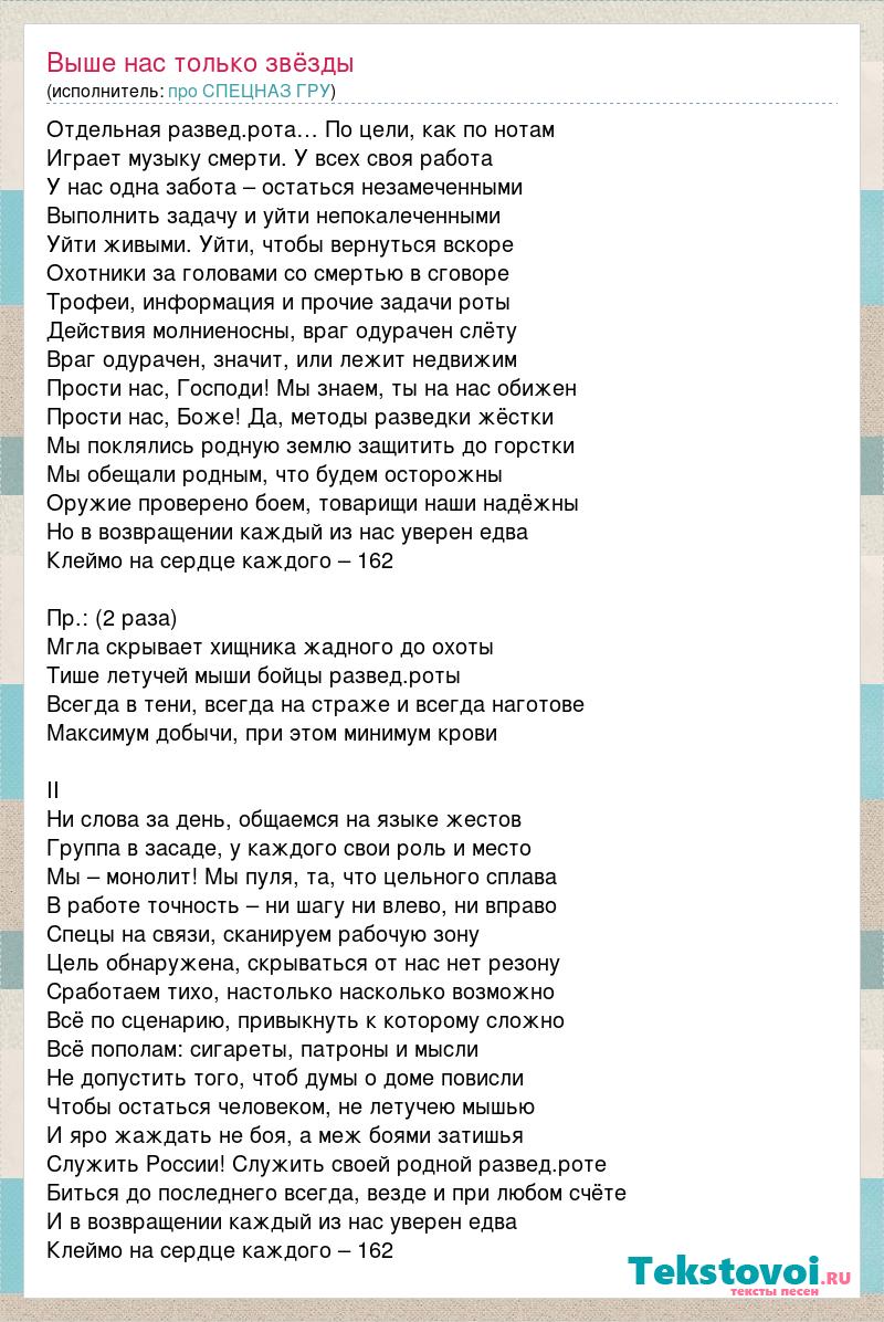 Отдельная развед.рота… По цели, как по нотам Играет музыку смерти. У всех своя работа У нас одна забота – остаться незамеченными Выполнить задачу и уйти непокалеченными Уйти живыми. Уйти, чтобы вернуться вскоре Охотники за головами со смертью в сговоре Трофеи, информация и прочие задачи роты Действия молниеносны, враг одурачен слёту Враг одурачен, значит, или лежит недвижим Прости нас, Господи! Мы знаем, ты на нас обижен Прости нас, Боже! Да, методы разведки жёстки Мы поклялись родную землю защитить до горстки Мы обещали родным, что будем осторожны Оружие проверено боем, товарищи наши надёжны Но в возвращении каждый из нас уверен едва Клеймо на сердце каждого – 162 Пр.: (2 раза) Мгла скрывает хищника жадного до охоты Тише летучей мыши бойцы развед.роты Всегда в тени, всегда на страже и всегда наготове Максимум добычи, при этом минимум крови II Ни слова за день, общаемся на языке жестов Группа в засаде, у каждого свои роль и место Мы – монолит! Мы пуля, та, что цельного сплава В работе точность – ни шагу ни влево, ни вправо Спецы на связи, сканируем рабочую зону Цель обнаружена, скрываться от нас нет резону Сработаем тихо, настолько насколько возможно Всё по сценарию, привыкнуть к которому сложно Всё пополам: сигареты, патроны и мысли Не допустить того, чтоб думы о доме повисли Чтобы остаться человеком, не летучею мышью И яро жаждать не боя, а меж боями затишья Служить России! Служить своей родной развед.роте Биться до последнего всегда, везде и при любом счёте И в возвращении каждый из нас уверен едва Клеймо на сердце каждого – 162