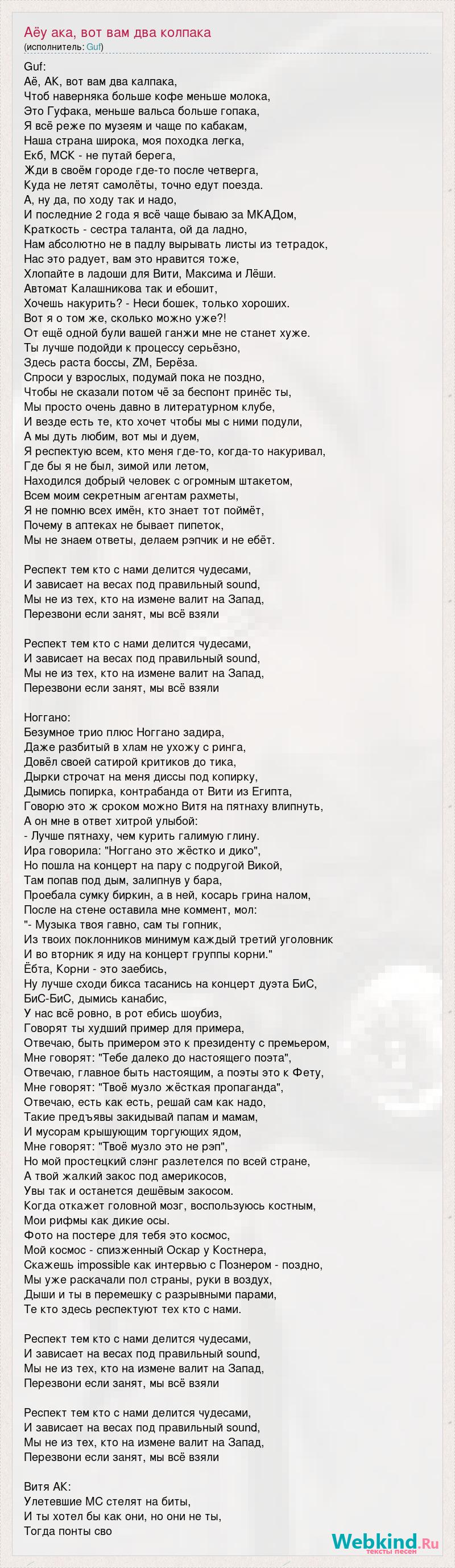 Guf: Аё, АК, вот вам два калпака, Чтоб наверняка больше кофе меньше молока, Это Гуфака, меньше вальса больше гопака, Я всё реже по музеям и чаще по кабакам, Наша страна широка, моя походка легка, Екб, МСК - не путай берега, Жди в своём городе где-то после четверга, Куда не летят самолёты, точно едут поезда. А, ну да, по ходу так и надо, И последние 2 года я всё чаще бываю за МКАДом, Краткость - сестра таланта, ой да ладно, Нам абсолютно не в падлу вырывать листы из тетрадок, Нас это радует, вам это нравится тоже, Хлопайте в ладоши для Вити, Максима и Лёши. Автомат Калашникова так и ебошит, Хочешь накурить? - Неси бошек, только хороших. Вот я о том же, сколько можно уже?! От ещё одной були вашей ганжи мне не станет хуже. Ты лучше подойди к процессу серьёзно, Здесь раста боссы, ZM, Берёза. Спроси у взрослых, подумай пока не поздно, Чтобы не сказали потом чё за беспонт принёс ты, Мы просто очень давно в литературном клубе, И везде есть те, кто хочет чтобы мы с ними подули, А мы дуть любим, вот мы и дуем, Я респектую всем, кто меня где-то, когда-то накуривал, Где бы я не был, зимой или летом, Находился добрый человек с огромным штакетом, Всем моим секретным агентам рахметы, Я не помню всех имён, кто знает тот поймёт, Почему в аптеках не бывает пипеток, Мы не знаем ответы, делаем рэпчик и не ебёт. Респект тем кто с нами делится чудесами, И зависает на весах под правильный sound, Мы не из тех, кто на измене валит на Запад, Перезвони если занят, мы всё взяли Респект тем кто с нами делится чудесами, И зависает на весах под правильный sound, Мы не из тех, кто на измене валит на Запад, Перезвони если занят, мы всё взяли Ноггано: Безумное трио плюс Ноггано задира, Даже разбитый в хлам не ухожу с ринга, Довёл своей сатирой критиков до тика, Дырки строчат на меня диссы под копирку, Дымись попирка, контрабанда от Вити из Египта, Говорю это ж сроком можно Витя на пятнаху влипнуть, А он мне в ответ хитрой улыбой: - Лучше пятнаху, чем курить галимую глину. Ира говорила: "Ноггано это жёстко и дико", Но пошла на концерт на пару с подругой Викой, Там попав под дым, залипнув у бара, Проебала сумку биркин, а в ней, косарь грина налом, После на стене оставила мне коммент, мол: "- Музыка твоя гавно, сам ты гопник, Из твоих поклонников минимум каждый третий уголовник И во вторник я иду на концерт группы корни." Ёбта, Корни - это заебись, Ну лучше сходи бикса тасанись на концерт дуэта БиС, БиС-БиС, дымись канабис, У нас всё ровно, в рот ебись шоубиз, Говорят ты худший пример для примера, Отвечаю, быть примером это к президенту с премьером, Мне говорят: "Тебе далеко до настоящего поэта", Отвечаю, главное быть настоящим, а поэты это к Фету, Мне говорят: "Твоё музло жёсткая пропаганда", Отвечаю, есть как есть, решай сам как надо, Такие предъявы закидывай папам и мамам, И мусорам крышующим торгующих ядом, Мне говорят: "Твоё музло это не рэп", Но мой простецкий слэнг разлетелся по всей стране, А твой жалкий закос под америкосов, Увы так и останется дешёвым закосом. Когда откажет головной мозг, воспользуюсь костным, Мои рифмы как дикие осы. Фото на постере для тебя это космос, Мой космос - спизженный Оскар у Костнера, Скажешь impossible как интервью с Познером - поздно, Мы уже раскачали пол страны, руки в воздух, Дыши и ты в перемешку с разрывными парами, Те кто здесь респектуют тех кто с нами. Респект тем кто с нами делится чудесами, И зависает на весах
