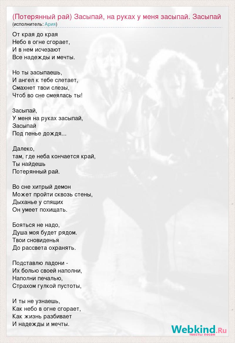 От края до края Небо в огне сгорает, И в нем исчезают Все надежды и мечты. Но ты засыпаешь, И ангел к тебе слетает, Смахнет твои слезы, Чтоб во сне смеялась ты! 3асыпай, У меня на руках засыпай, Засыпай Под пенье дождя... Далеко, там, где неба кончается край, Ты найдешь Потерянный рай. Во сне хитрый демон Может пройти сквозь стены, Дыханье у спящих Он умеет похищать. Бояться не надо, Душа моя будет рядом. Твои сновиденья До рассвета охранять. Подставлю ладони - Их болью своей наполни, Наполни печалью, Страхом гулкой пустоты, И ты не узнаешь, Как небо в огне сгорает, Как жизнь разбивает И надежды и мечты.