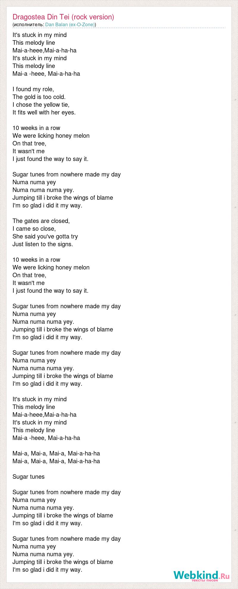 It's stuck in my mind This melody line Mai-a-heee,Mai-a-ha-ha It's stuck in my mind This melody line Mai-a -heee, Mai-a-ha-ha I found my role, The gold is too cold. I chose the yellow tie, It fits well with her eyes. 10 weeks in a row We were licking honey melon On that tree, It wasn't me I just found the way to say it. Sugar tunes from nowhere made my day Numa numa yey Numa numa numa yey. Jumping till i broke the wings of blame I'm so glad i did it my way. The gates are closed, I came so close, She said you've gotta try Just listen to the signs. 10 weeks in a row We were licking honey melon On that tree, It wasn't me I just found the way to say it. Sugar tunes from nowhere made my day Numa numa yey Numa numa numa yey. Jumping till i broke the wings of blame I'm so glad i did it my way. Sugar tunes from nowhere made my day Numa numa yey Numa numa numa yey. Jumping till i broke the wings of blame I'm so glad i did it my way. It's stuck in my mind This melody line Mai-a-heee,Mai-a-ha-ha It's stuck in my mind This melody line Mai-a -heee, Mai-a-ha-ha Mai-a, Mai-a, Mai-a, Mai-a-ha-ha Mai-a, Mai-a, Mai-a, Mai-a-ha-ha Sugar tunes Sugar tunes from nowhere made my day Numa numa yey Numa numa numa yey. Jumping till i broke the wings of blame I'm so glad i did it my way. Sugar tunes from nowhere made my day Numa numa yey Numa numa numa yey. Jumping till i broke the wings of blame I'm so glad i did it my way.
